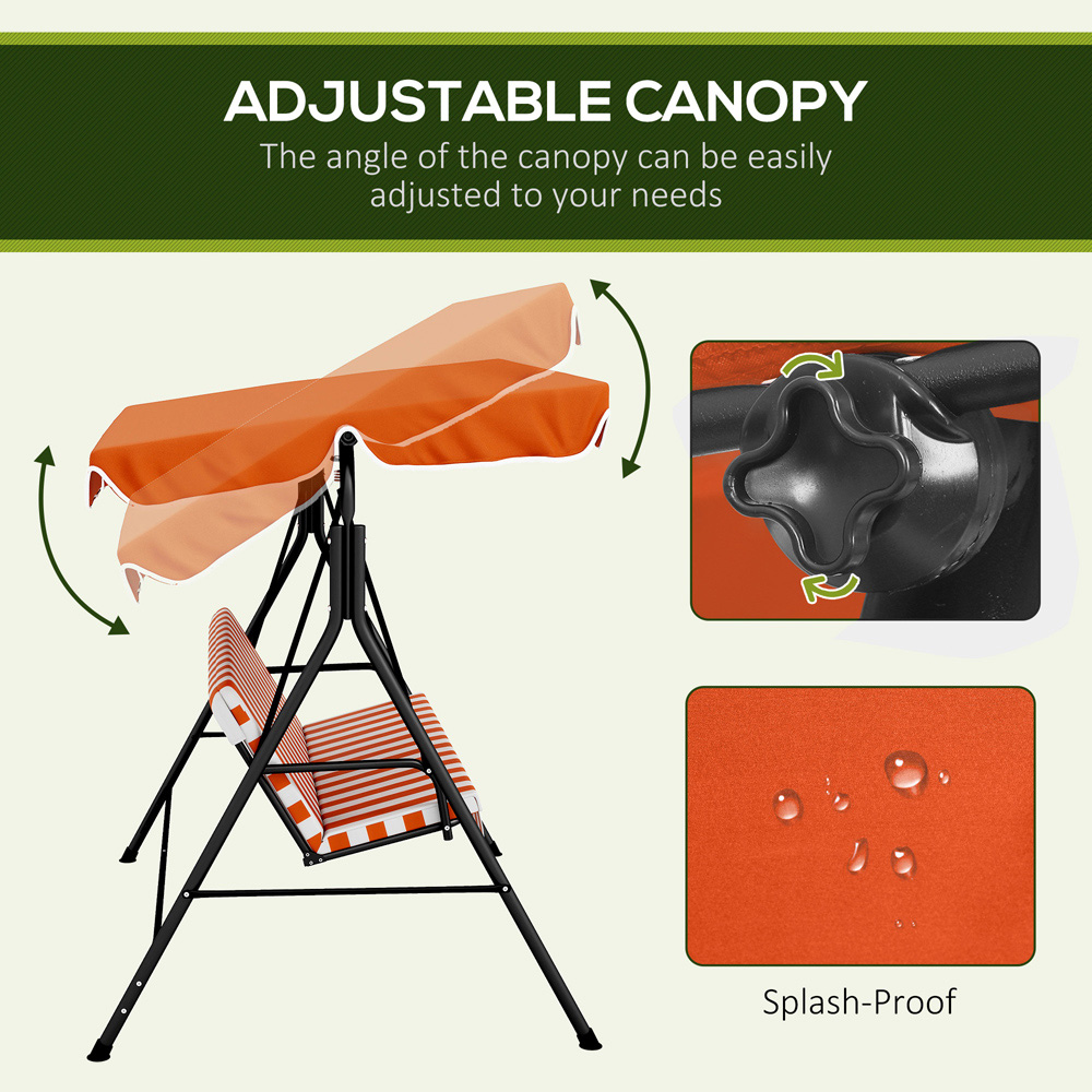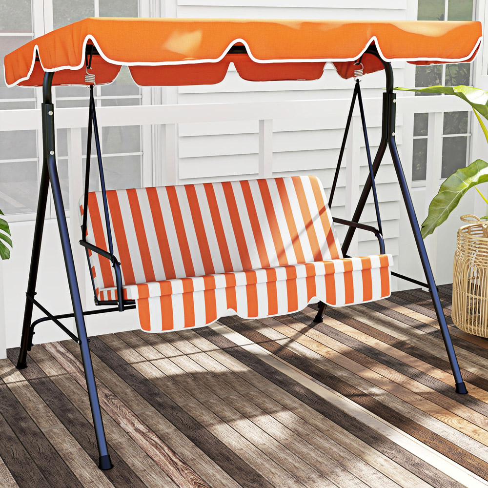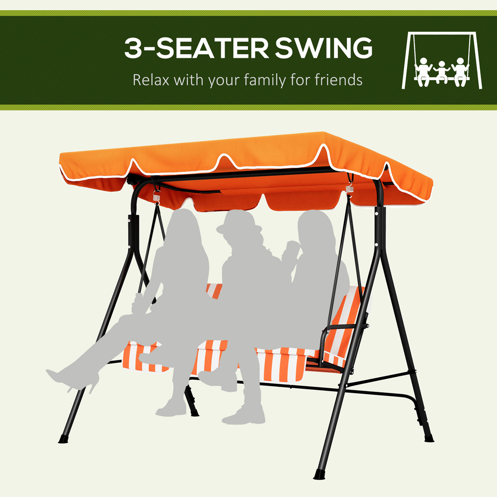 Discover the perfect blend of luxury and comfort with this Outsunny 3 Seater Orange and White Swing Chair with Canopy, designed to elevate your outdoor leisure experience. Its robust steel frame, elegantly powder-coated for enhanced durability, offers a sturdy and reliable structure that promises longevity. The adjustable canopy allows you to effortlessly customise the angle for protection against sun glare, UV rays, and light rain, ensuring a serene atmosphere for relaxation. Experience ultimate comfort with a cushioned seat featuring a high back, catering to those who prioritise both aesthetic appeal and support in their outdoor furniture. Ideal for garden enthusiasts, this swing chair can accommodate up to 240kg, blending style with functionality for a premium lifestyle. Overall Dimension: H153 x W110 x L172cm. Seat Size: W48 x L132cm. Seat Height: H45cm. Cushion Thickness: 6cm. Weight Capacity: 200kg.