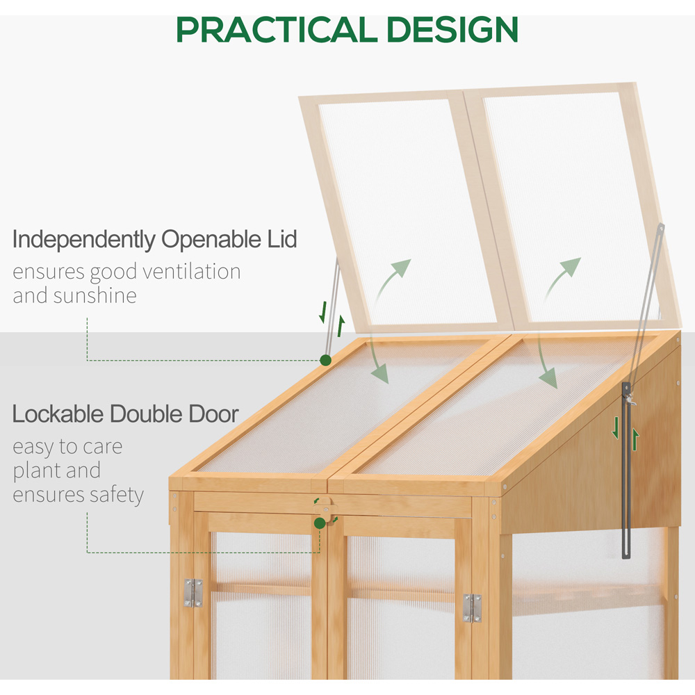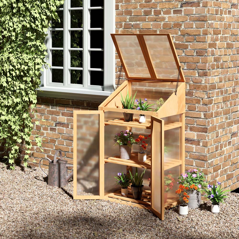 Give your plants and vegetables somewhere to grow healthily with the Outsunny 3 Tier Brown Wooden Polycarbonate 1.6 x 4ft Greenhouse. With a solid fir wood frame, durable polycarbonate panels, and three removable shelves, this mini greenhouse is equipped to help your plants thrive. The panelled design prevents liquids from building up and creates space for vegetables, fruits, and more. The easy-access doors and latch lock provide added security, while the 4mm plastic panels allow for maximum light transmission and heat retention. Don't settle for anything less than the best for your plants - invest in this reliable and effective plant grow house today.