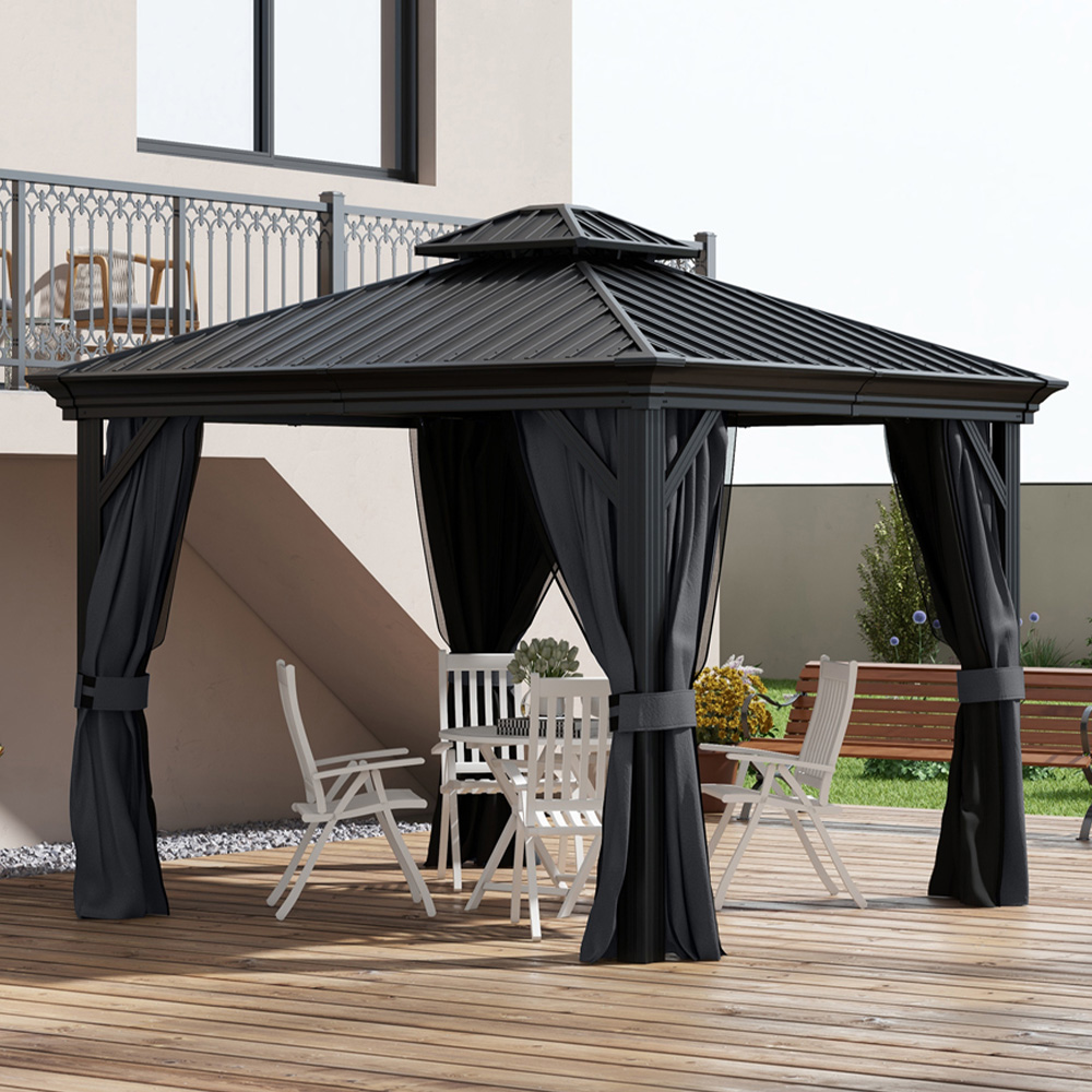 Upgrade your outdoor space with Outsunny 3 x 3.7m Dark Grey 2 Tire Aluminium Gazebo. This garden pavilion can be perfect for creating the perfect party atmosphere. The aluminium frame and the galvanised steel canopy provides a strong and sturdy standing place. The curtains and netting create a comfortable and safe space. Set up this hard-roof gazebo in the garden for anything you like such as BBQs, special events and all-day gatherings with friends.