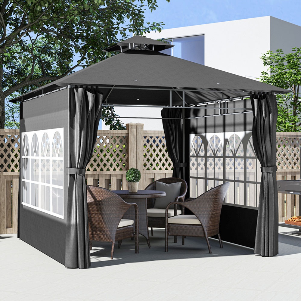 Elevate your outdoor gatherings with the Outsunny 3 x 3 m Garden Gazebo! This gazebo with sides fits 4-6 people and features a PA-coated double-tier roof for superior UV protection and enhanced airflow. Splash-resistant material with grommet holes prevents water build-up, while removable sidewalls with clear windows offer privacy and panoramic views, making it a must-have garden shelter.