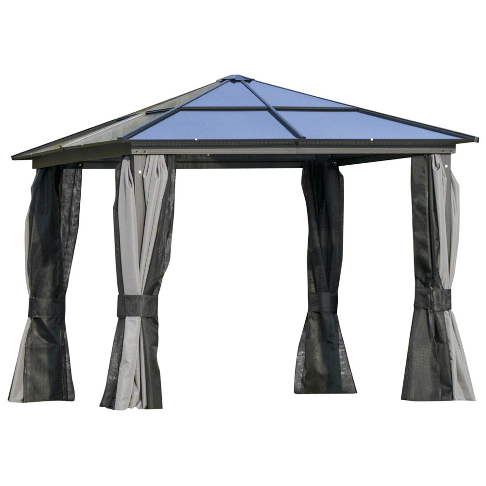 Make a stunning garden addition with this 3 x 3m Black Gazebo Canopy with Roof from Outsunny. Offering privacy and protection, this canopy comes with a polycarbonate roof and curtains, which can be tied back when not needed. Also, it includes mesh netting to ensure better air circulation and keep pests away. Apart from this, the tent offers better protection from the sun, rain, and wind and keeps the inside cool. It comes complete with a solid roof for anyone looking to create the right impression for their next BBQ and outdoor party. Size: 3 x 3m.