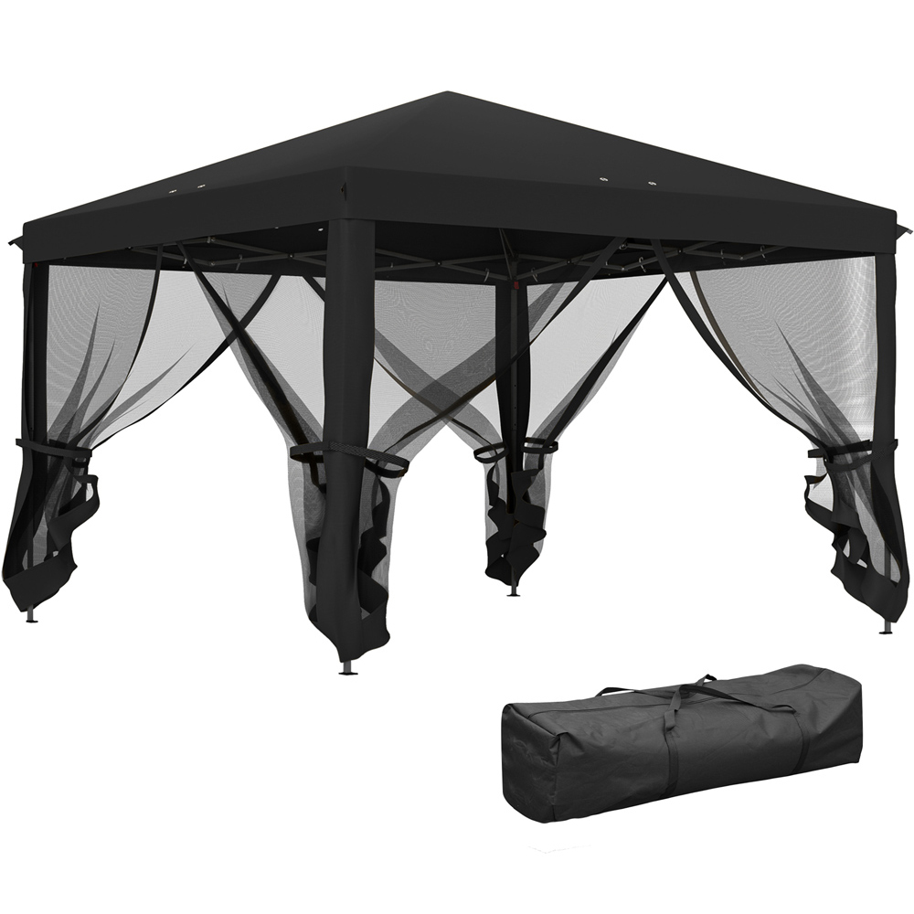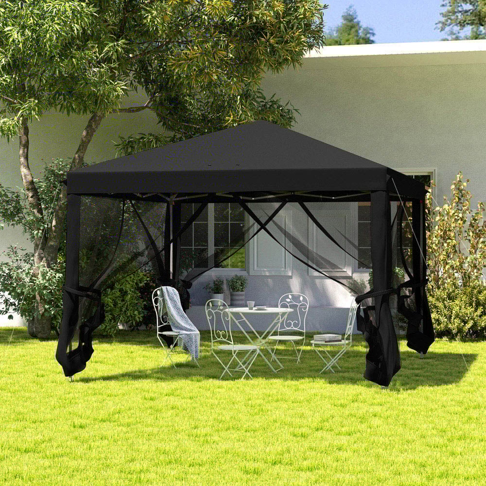 The Outsunny 3 x 3m pop-up gazebo with sides is perfect for your garden this season and beyond. Featuring a three-level adjustable metal frame, it provides a sturdy core that you can set to your preferred height. The removable mesh curtains allow you to create a private or open atmosphere with ease. Plus, it comes with a bag for easy storage and transportation.