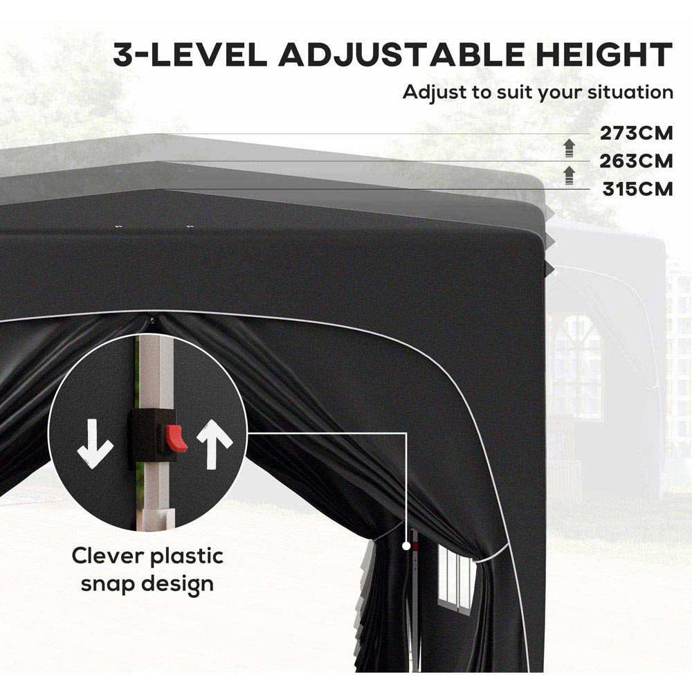 Easy outdoor gatherings with this Outsunny pop-up gazebo. Fitted with a UPF50+ fabric canopy, you and your guests are shielded against 98% UV rays, with a door to enter/leave easily, plus windows to bring light in. Set the metal frame between 253cm, 263cm and 273cm - pick the height you require. Comes with guy ropes and ground stakes for weight - with a bag to keep it in when not being used.