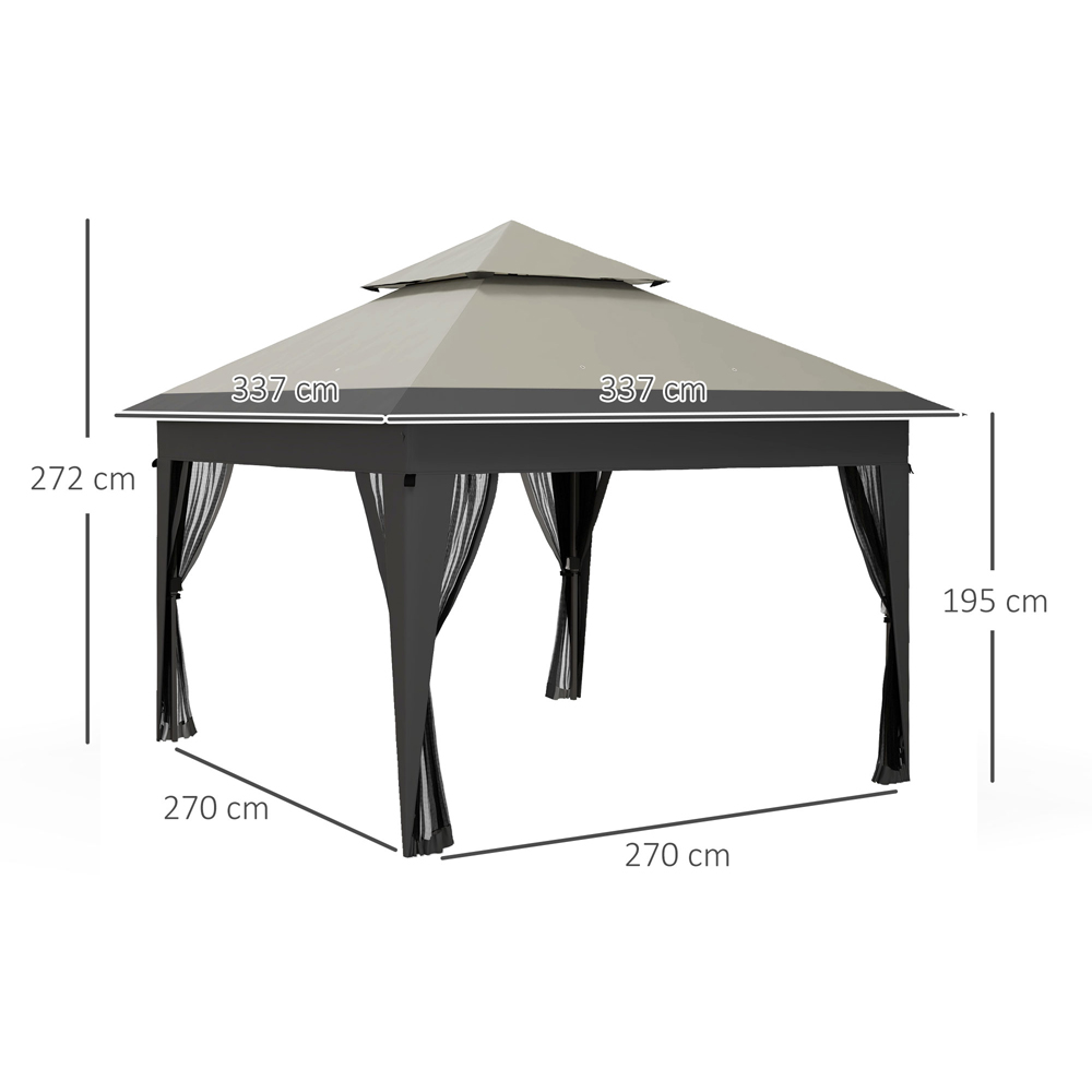 Enjoy partying outdoors with this Outsunny Grey Marquee Party Tent Pop-Up Gazebo. Perfect for gatherings, this gazebo can be assembled in no time to get started with the preparations. The freely adjustable steel frame has a strong core, which can be set to a height most suitable for you. Made for outdoors, the double Oxford fabric canopy top offers UV protection, good air circulation and wind resistance. Also, the powder-coated steel frame can handle wind, rain and sun exposure. Its four mesh side panels offer maximum ventilation and a clear view, while the plastic hooks make it easy to hang. To keep the tent steady, the stakes, ropes and sandbags help stabilise your garden shelter on soft ground. Spacious and large, this gazebo is perfect for providing shade for up to eight people. Plus, featuring a central button, this design enables effortless setup and breakdown by a single person.