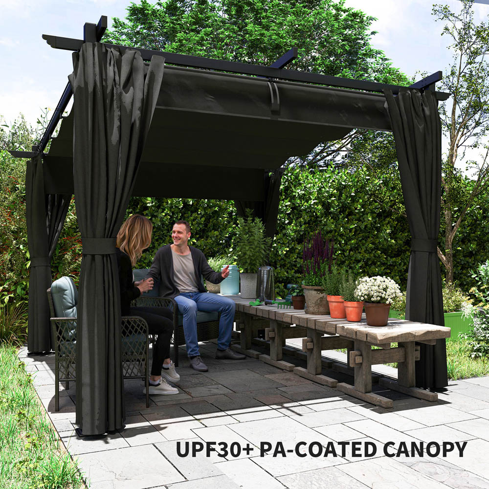 With a retractable roof and four curtains, it's easy to tailor your outdoor time with this Outsunny 3 x 3 m garden pergola. The copted canopy provides UPF30+ protection, and shields you against small showers. The adjustable canopy glides smoothly, to let in as little or as much sunshine as you wish. Comes with 8x ground stakes and 8x expansion screws to pin to soft and hard ground.