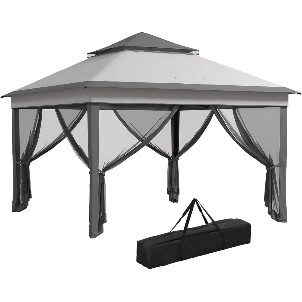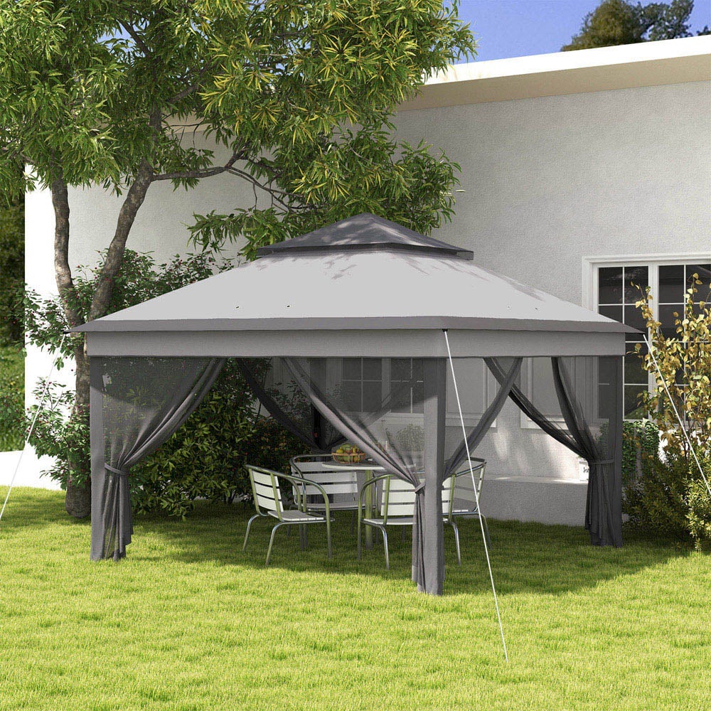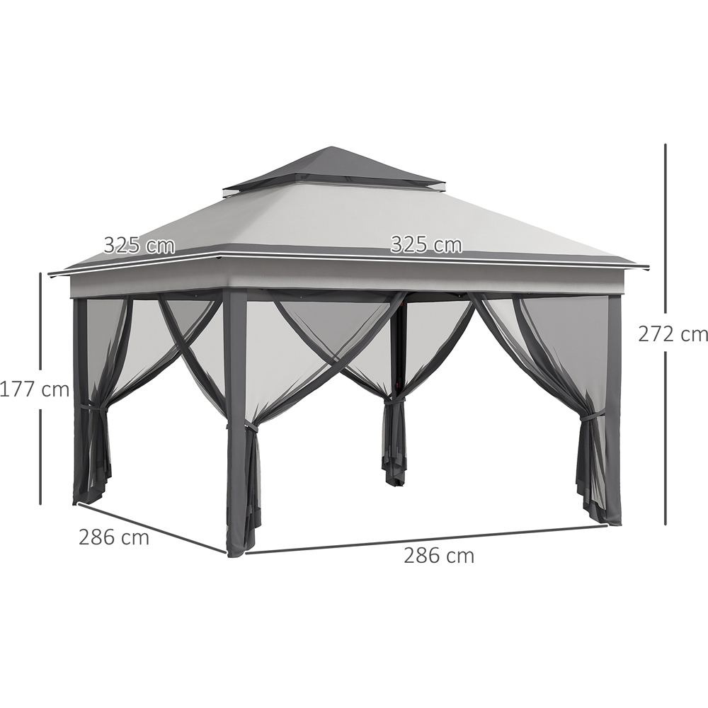 The Outsunny 3 x 3m Grey Pop Up Gazebo is a convenient shelter for your outdoor gatherings. It can be assembled quickly and easily. The gazebo features a powder coated metal frame that provides a strong core. The height of the gazebo is adjustable between 252cm, 262cm, and 272cm, allowing you to set it at the level you desire. The removable mesh curtains enable you to create a private or open atmosphere whenever you want, thanks to the easy zip fastening. The gazebo also comes with a carrying bag for easy storage and transportation. It has enough room to accommodate approximately 6 to 9 people. The portable pop-up design allows for quick setup and takedown, saving you time and effort. The gazebo includes guy ropes and ground stakes to secure it to the ground.