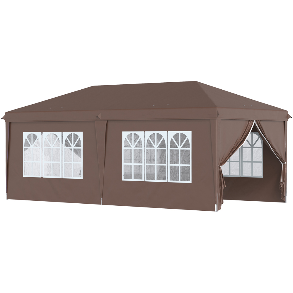 Create shelter in any outdoor setting with the Outsunny 3 x 6m Brown Pop Up Gazebo. With its three-level adjustable height, it is perfect for various occasions such as outdoor parties, gatherings, and camping trips. The powder coated steel frame ensures durability and reliability for outdoor use. Additionally, the 12 holes on the top prevent water build up, providing added protection. This gazebo comes with guy ropes and ground stakes to securely set it up in your garden. When not in use, it can be easily folded and stored in the included bag. Its pop-up design allows for quick and hassle-free setup, making it ideal for garden parties, BBQs, and other outdoor events. The four sidewalls with windows can be easily assembled and removed using the hook and loop fasteners. The front and back walls have zippers for easy access. The silver-coloured lining of the protective canopy helps retain heat inside while also protecting against extreme heat and direct sunlight.