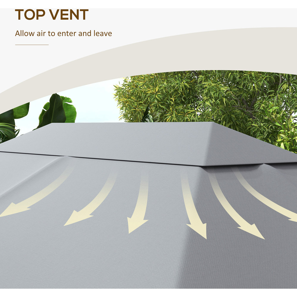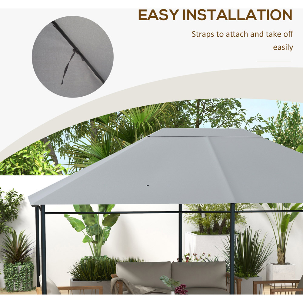 Relax outdoors with a friend, thanks to this three x four m Light Grey Polyester Gazebo Canopy Replacement Cover from Outsunny. Made from PA-coated polyester, the fabric is tough and protects you while standing in the frame. The top vent allows air to enter and leave gently, creating better ventilation. Its protective coating shields against UV30+ and stands stable in high winds.