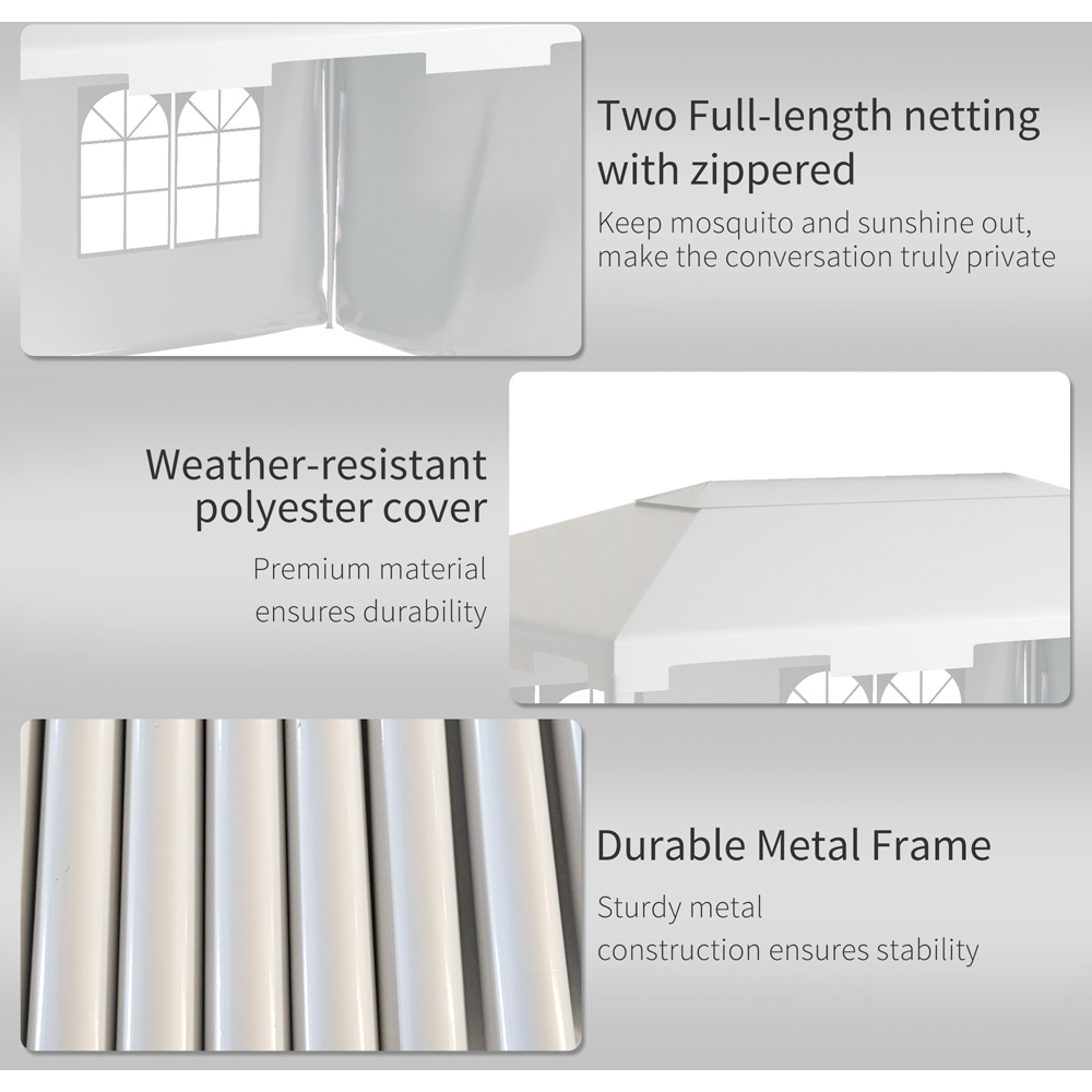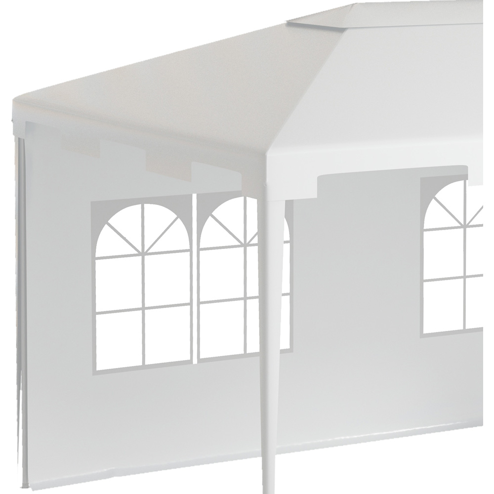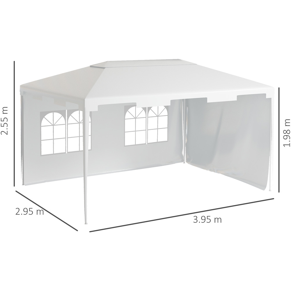 The Outsunny White Garden Gazebo with 2 Sidewalls is a versatile marquee camping gazebo that can be used for various events such as car boot sales, garden parties, and family gatherings. With its steel frame, this marquee offers strength and durability. The 3m x 4m size provides ample space inside for any occasion. You have the option to open up fully with the two removable walls, allowing for a private or open atmosphere. One of the walls features two clear windows, allowing you to see outside. The sloped roof is weather resistant, protecting against light rain and other elements. This large and spacious gazebo is perfect for accommodating a large number of people, making it suitable for family parties, weddings, picnics, sports events, outdoor vendors, craft fairs, and job sites. The two removable walls can be taken off to allow plenty of air and light inside, or kept fixed in place to create a private atmosphere. The weather-resistant polyester shell protects the inside against gentle elements such as rain, wind, and direct sunlight. The waved edges add a touch of elegance to this marquee.