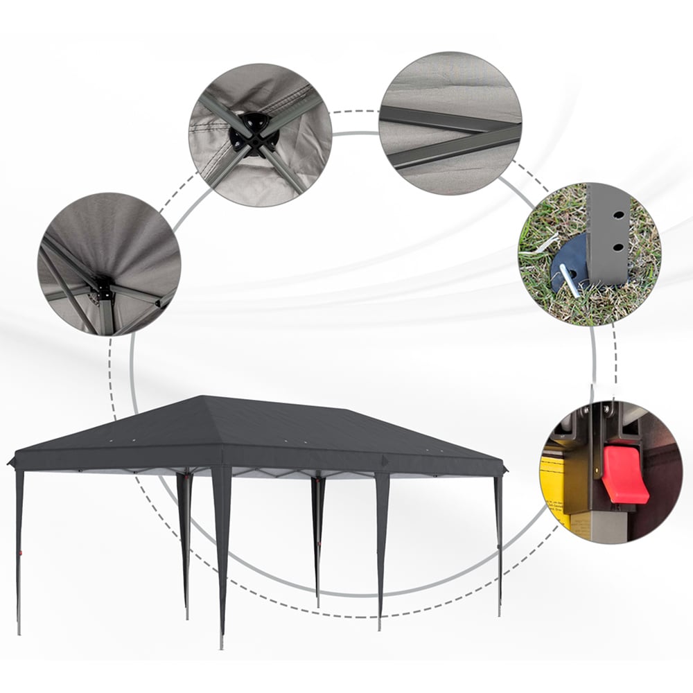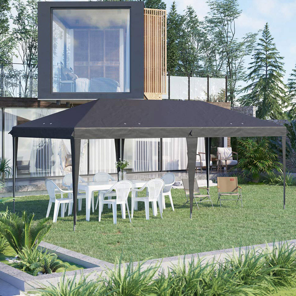 This Outsunny 6 x 3m pop-up gazebo is a great way to create a shaded place when you require it. The garden shelter is made up of a powder-coated steel frame with a 210D Oxford cloth canopy cover. A foldable and easy-assembly design, it's perfect for temporary use and great for outdoor gatherings - like garden parties, BBQs, receptions, car boot sales and more. The silver-coloured lining helps keep inside heat in while protecting against extreme heat and direct sunlight. Three different heights - choose the best for you. It comes with ground pegs and guy ropes to secure it to the ground for extra stability. It comes complete with a handy carry bag. Powder-coated metal for extra strength, this strong and spacious structure is perfect for hosting plenty of friends, family and others in the camping gazebo.