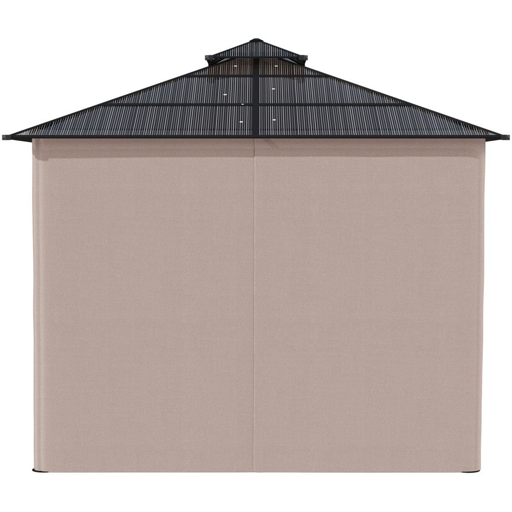 Enjoy outdoor gathering with Outsunny 3 x 3m Polycarbonate Roof Outdoor Gazebo. The hardtop gazebo is made for practically every outdoor space. It comes with a polycarbonate roof - a strong top for extended use, which creates shelter inside. With a powder-coated metal and aluminium blend frame - the structure is strong, with curtains to create privacy whenever you want. It also comes with netting to protect the inside from any bugs. Specifications: Colour: Black roof, dark grey frame and khaki curtains. Materials: Aluminum, metal, PC Board, Polyester, Nylon. Overall dimensions: 300L x 300W x 278Hcm. Eaves Height: 206cm. Column Spacing: 254L x 254Wcm.