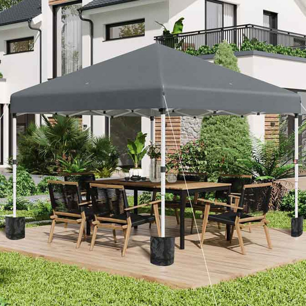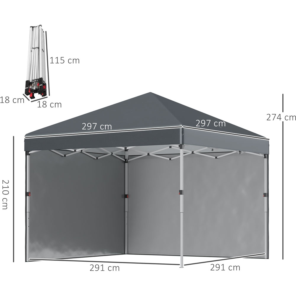 Whether it's a camping trip, cookout, or just a place to protect your outdoor couch, Outsunny's 3 x 3m Grey Pop-Up Gazebo with sides goes up in minutes. Complete with a carrying bag, which you can easily transport wherever you need, they unfold fast to provide UV30+ protection. Featuring a two-wall design, the garden gazebo is a mix of an open and closed design which creates a safe shelter that doesn't feel too cramped with all your guests standing all together, while the walls are also removable. The custom height canopy allows you to easily customize the height to fit the occasion. You can raise or lower the canopy between three height settings, 274, 264 and 254cm. The height-adjustable legs lock in place at the push of a button. The stakes, guy ropes, and sandbags work together to stabilize your gazebo on soft ground, and holes on top drain away the rain. It not only stops sunburns but also aids other summer woes. Never leave your shelter unattended; take it down before a major storm rolls through. Always use both the included stakes and the guy ropes when using your pop-up gazebo. Assembly required. Overall Dimensions: L 297 x W 297 x H 274cm. Folded Size: L 115 x W 18 x H 18cm. Eaves Height: 210cm. Column Spacing: L 291 x W 291cm. Walls Size: W 297 x H 197cm. Sand Bag Size: L 33 x W 38cm.