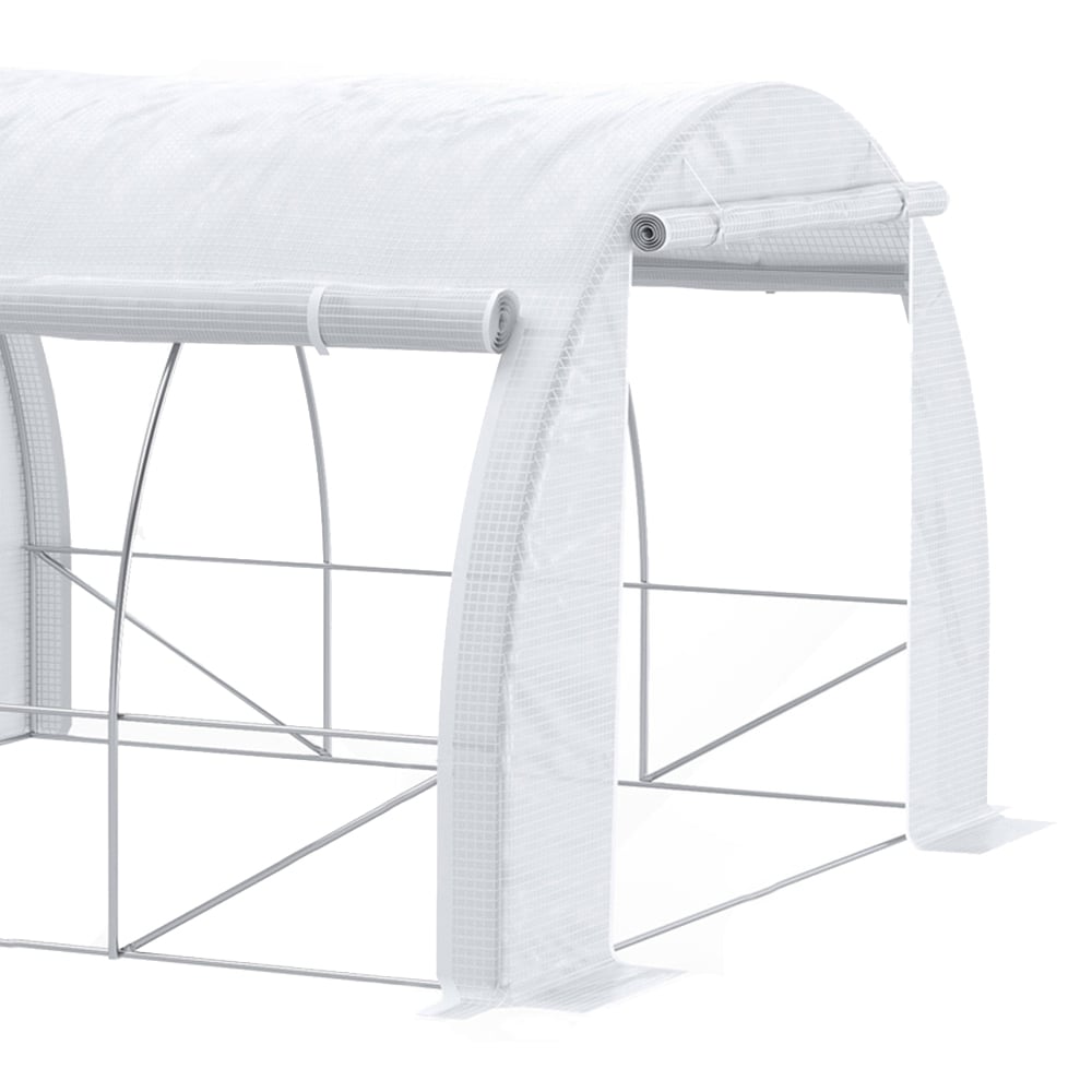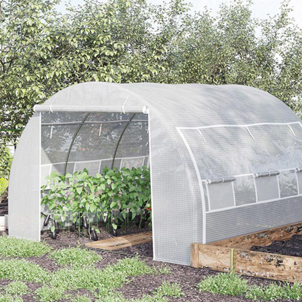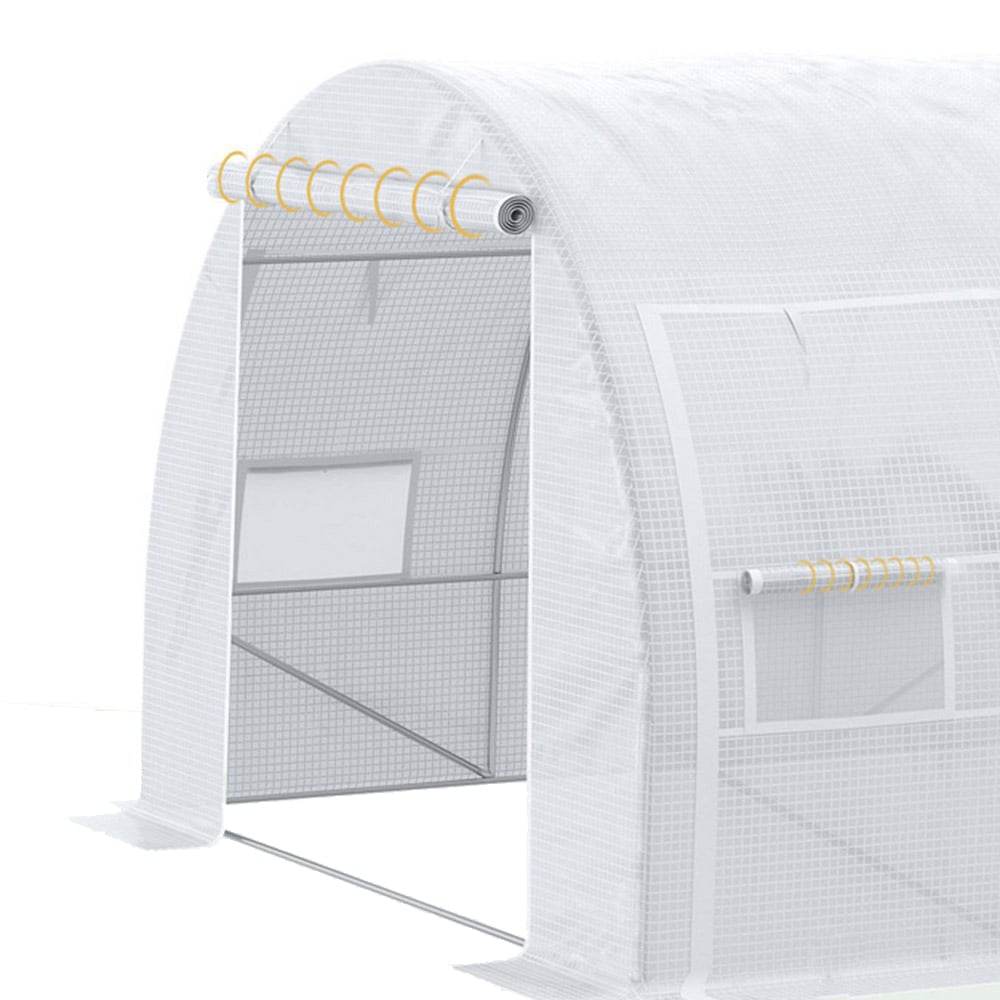 This Outsunny garden polytunnel greenhouse is perfect for the home gardening enthusiast looking for a way to stay in the soil all year round! The galvanised steel frame and PE cover will keep your plants and vegetables more secure than on their own. This walk-in heavy-duty greenhouse is an ideal way to extend your growing season by protecting plants from cold and birds while managing your plants. Suitable for growing tropical plants, vegetables, fruits, flowers, etc. It features a large zippered door and six windows for easy access and ventilation. And both sides of the greenhouse can be completely opened and rolled up with ropes, which makes for bigger operating space and better ventilation. The greenhouse features a PE mesh grid cover, UV and water-resistant, to protect plants while allowing nourishing sunlight to pass through.