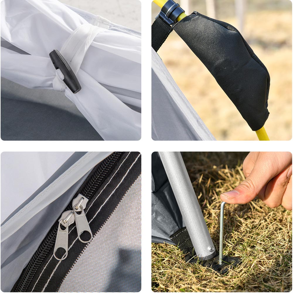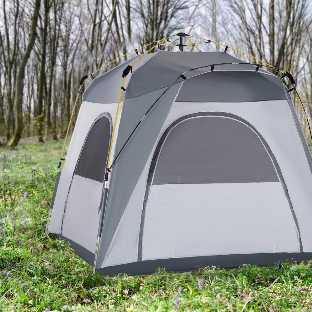 Camp with plenty of space with this Outsunny 4-Person Automatic Camping Tent which is easy to unfold and set up. Featuring pre-attached poles and a hydraulic pressure mechanism, the tent pops open up easily for a fuss-free setup and is also easy to fold up too. The 190T polyester shell is weather-resistant and protects against light weather for use from spring to autumn. This tent also features three windows for air ventilation, with the large front door making it easy to enter and leave. Plus, it comes with a carry bag and eight ground stakes for added convenience.