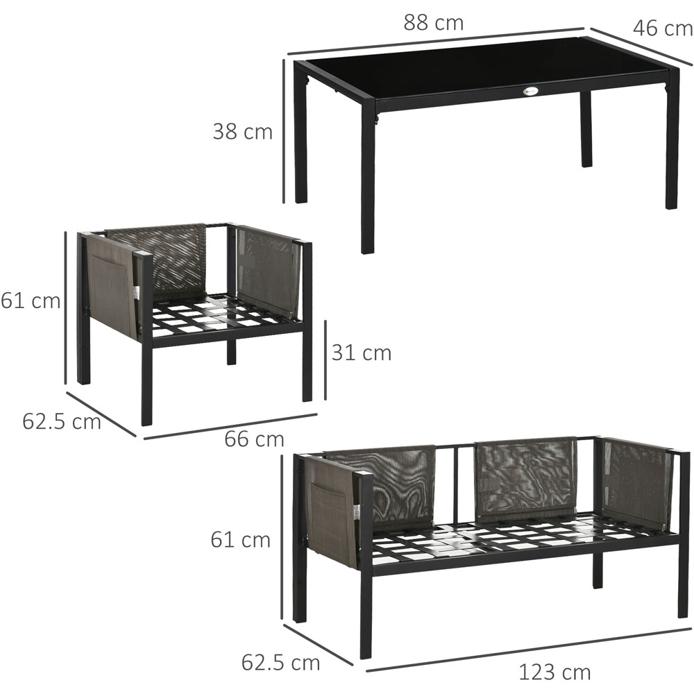 Enjoy outdoor family and friends gatherings with Outsunny 4 Piece Grey Metal Garden Set. The set comes with two armchairs, a two-seater sofa and a matching table. Each frame is made powder coated steel - making it strong and supportive. With thick padded cushions on the seats and backs for comfort - it also comes complete with a tempered glass-top table. Assembly required. Specifications: Colour: light grey cushion, dark grey Texteline pocket, black frame. Material: Steel, polyester, sponge, Texteline, tempered glass, Two-seater sofa: 123W x 62.5D x 61Hcm, Armchair: 66W x 62.5D x 61Hcm. Table: 88W x 46D x 38Hcm. Seat Size: Two-seater Sofa: 116W x 59Dcm. Armchair: 59W x 59Dcm. Backrest Width: Two-seater Sofa: 116 cm. Armchair: 59cm. Backrest Height (to seat): 31cm. Seat Cushion Size: Two-seater Sofa: 116W x 59D x 7Hcm. Armchair: 59W x 59D x 7Hcm. Back Cushion Size: 59W x 37D x 8Hcm. Side Pocket: 30W x 26Dcm. Weight Capacity: 240kg(Sofa), 120kg(Armchair), 30kg(Table). Protect your garden furniture with our durable and waterproof covers. Explore our wide range of heavy-duty