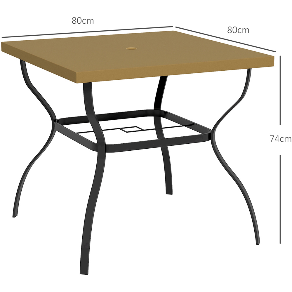 A place to gather round, with the option to keep safely shaded too - this Outsunny garden dining table. It features a F44mm middle hole, allowing you to place a parasol umbrella in and keep held in place. The 80cm tabletop seats four people, so you can sit with company. Fully made from steel, this square garden table is a tough piece suitable for year-long outdoor use.