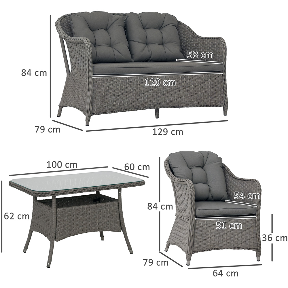 Look forward to afternoons relaxing outside, thanks to this four-piece Outsunny set. Set comes with two chairs, a loveseat and matching coffee table. Aluminium frame for a strong structure, with plastic wicker rattan for a stylish garden furniture set. The table sits level with the chairs - a place to dine from. Seat and back cushions for comfort. Relax in style and comfort all year round.