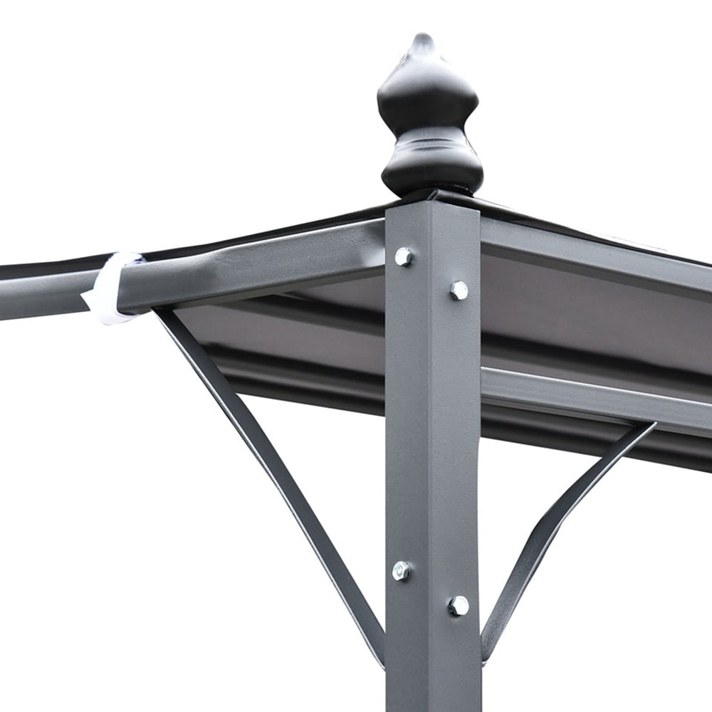 Create the perfect outdoor gathering space with the Outsunny 4 x 3m Grey Canopy Metal Gazebo. This elegant gazebo features a taller back and shorter front, providing shelter against direct sunlight. The waved connecting frame is covered with a 180gsm polyester canopy, while the scroll design on the front and wall-mounted canopy adds a touch of sophistication. With 16 drainage holes on the top to prevent water accumulation and eight ground stakes to secure it to the ground, this gazebo is perfect for family gatherings, parties, and other outdoor events.