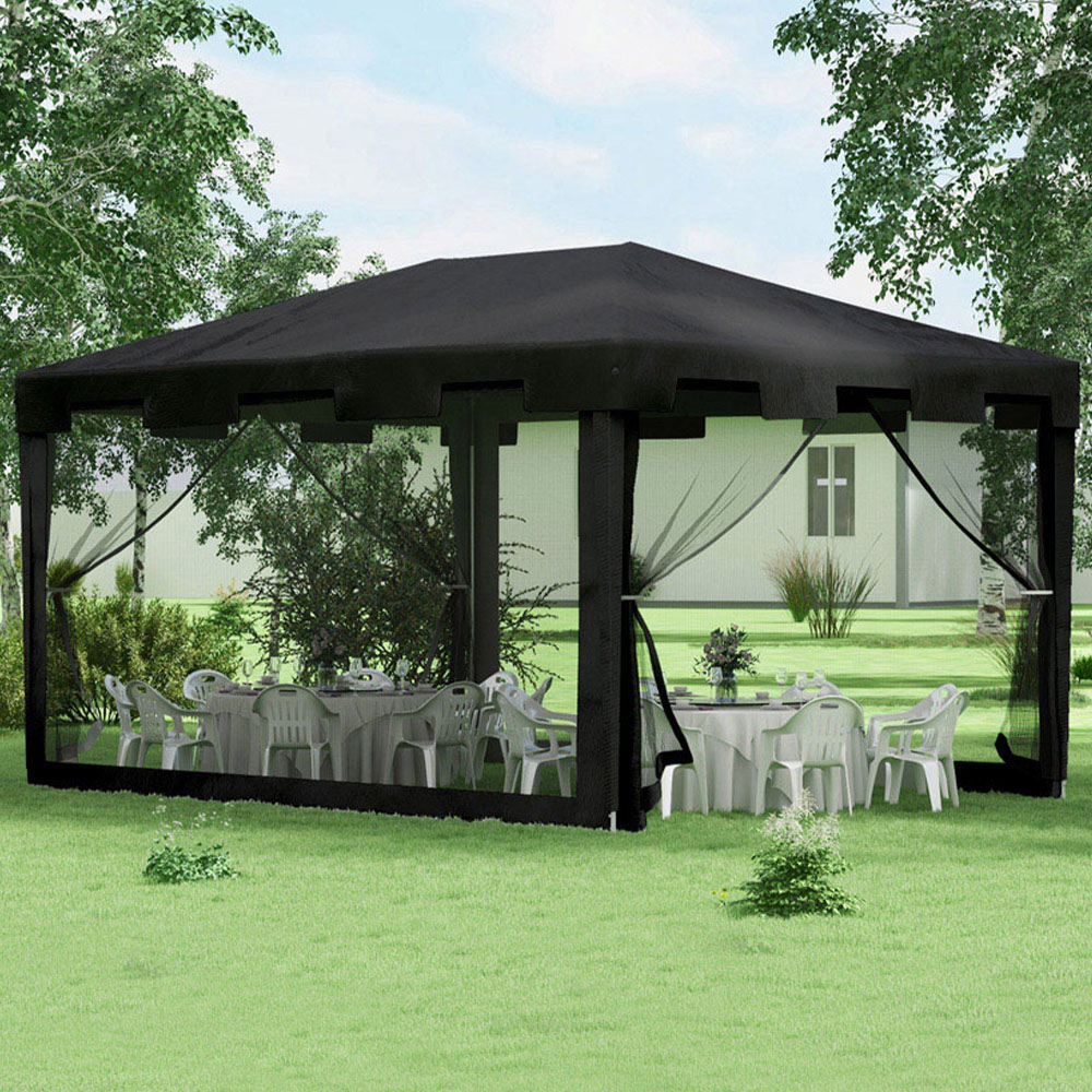 Grab your favourite drink and enjoy the shade of freedom with the Outsunny Black Marquee Gazebo Party Tent. This gazebo is perfect for any family gathering, picnics and camping purposes. This marquee has a sturdy powder-coated steel frame structure with a weather-resistant fabric roof that protects against unwanted weather elements and eight drainage holes on top to prevent rainwater build-up. It also features zipped entrances and sides that can be removed to allow plenty of air and light inside, creating an open-air area for everyone. The package includes four guy ropes and eight ground stakes. Dimensions: 4 x 3m.