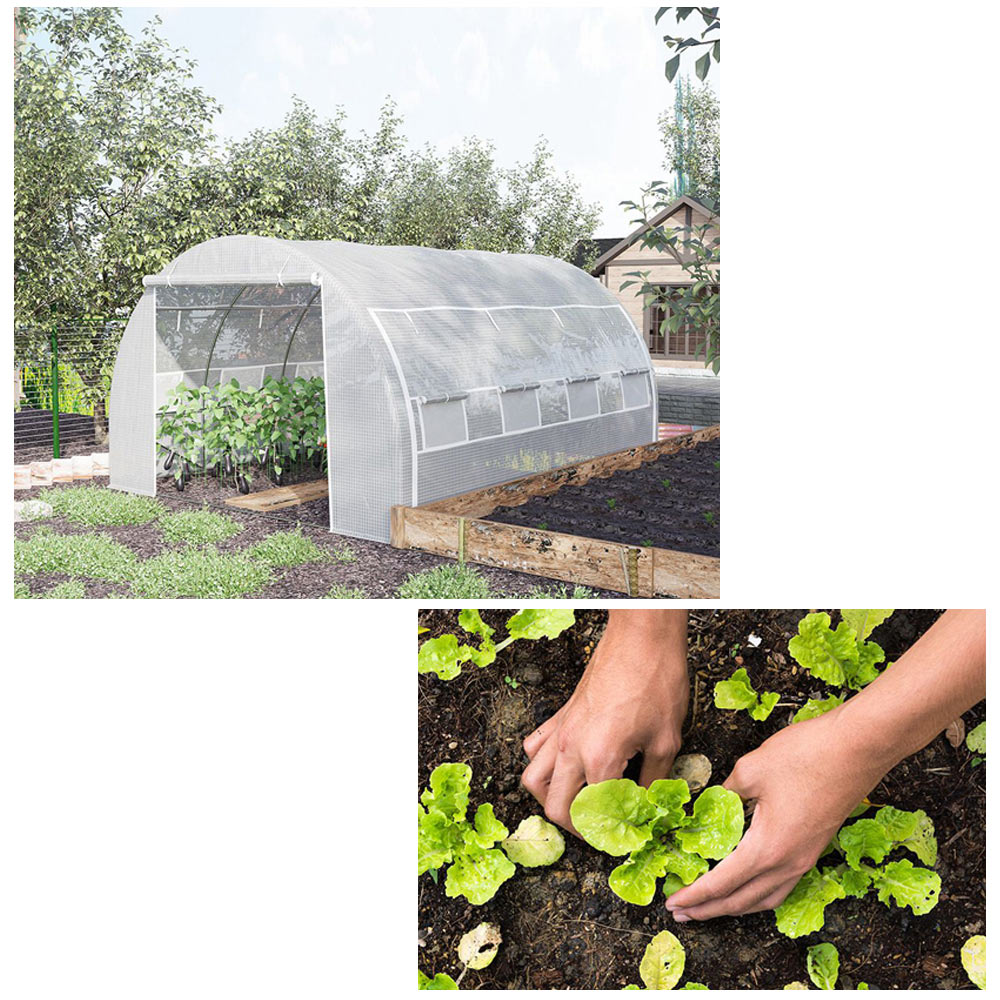 This Outsunny garden polytunnel greenhouse is perfect for the home gardening enthusiast looking for a way to stay in the soil all year round! The galvanised steel frame and PE cover will keep your plants and vegetables more secure than on their own. This walk-in heavy-duty greenhouse is an ideal way to extend your growing season by protecting plants from cold and birds while managing your plants. Suitable for growing tropical plants, vegetables, fruits, flowers, etc. It features a large zippered door and eight windows for easy access and ventilation. And both sides of the greenhouse can be completely opened and rolled up with ropes, which makes for bigger operating space and better ventilation. The greenhouse features a PE mesh grid cover, UV and water-resistant, to protect plants while allowing nourishing sunlight to pass through.