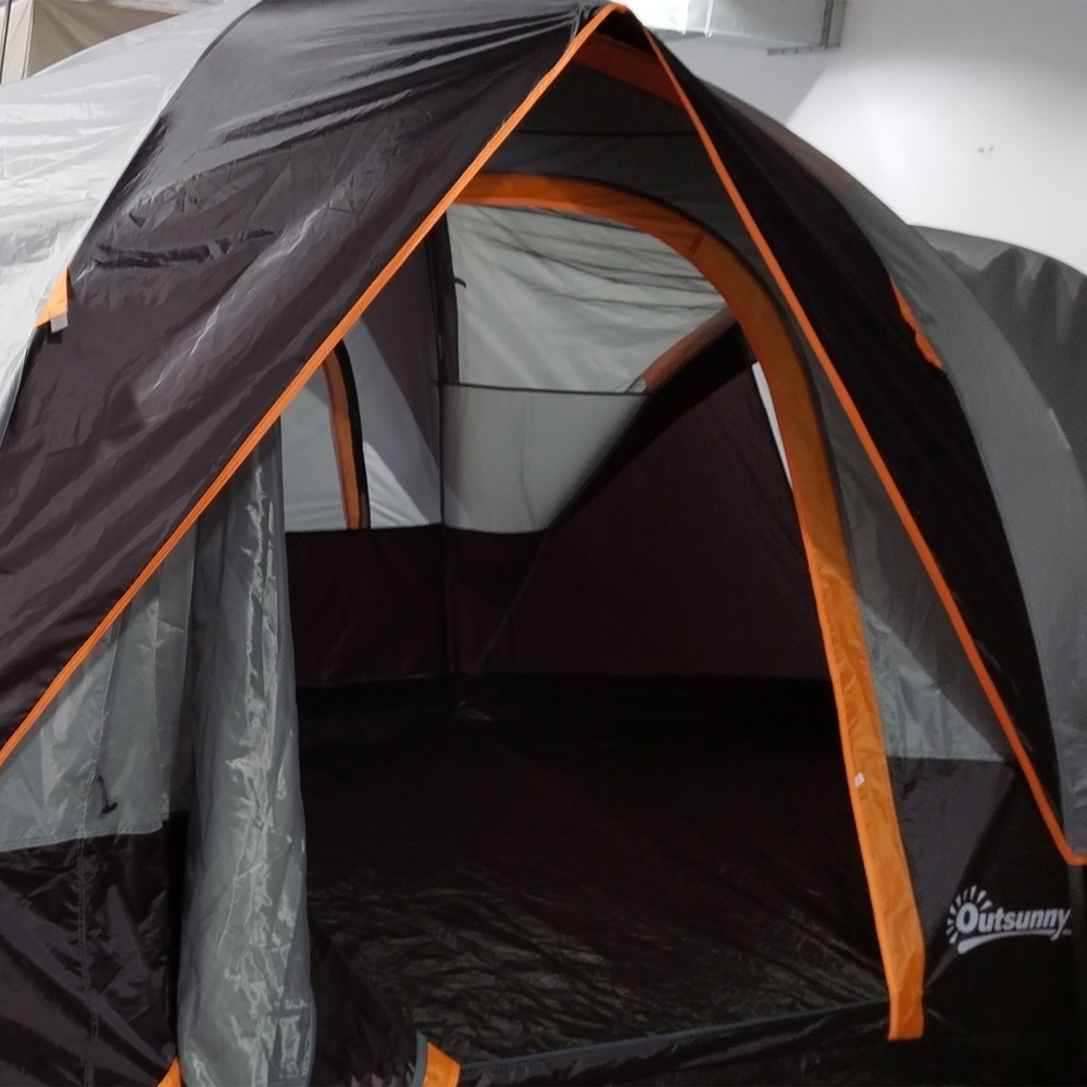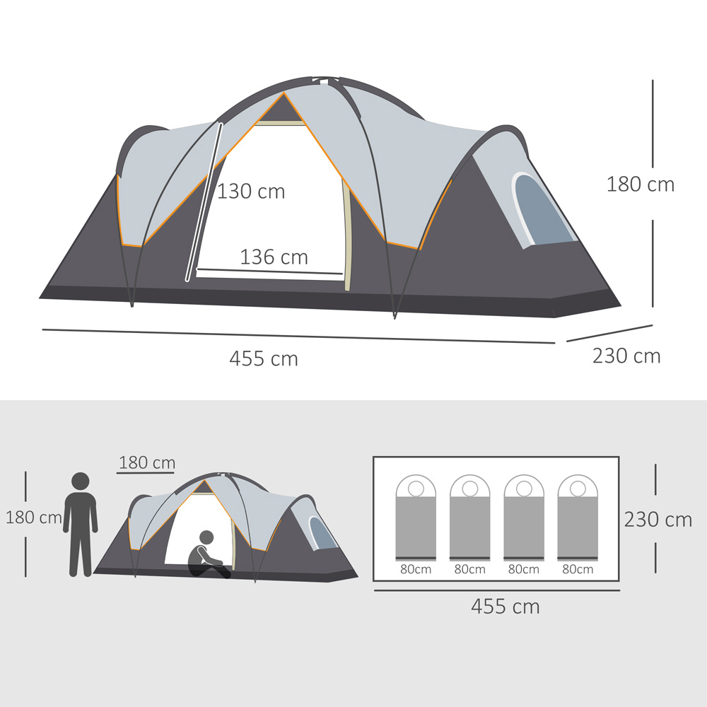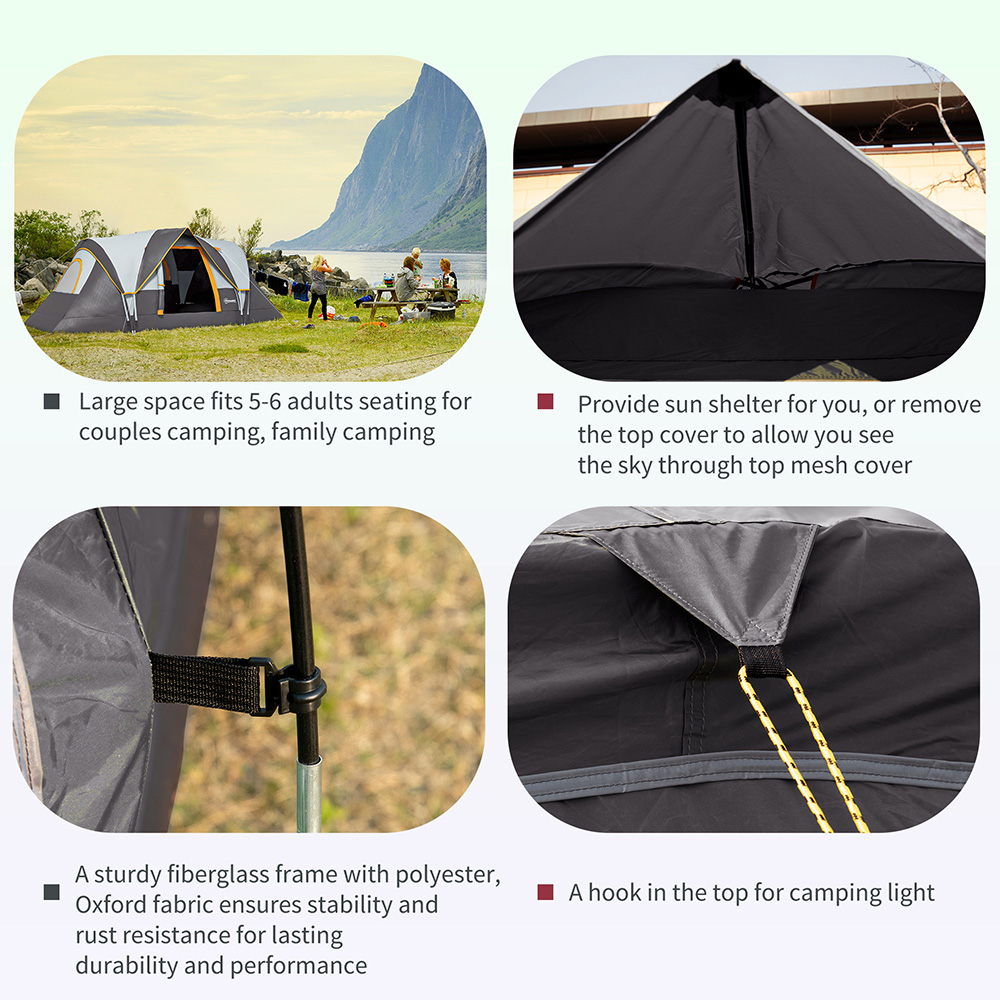 Make camping even more fun and exciting with the Outsunny 5-6 Person Camping Tent Multicolour. This camping tent comes with a large room, ideal for five to six people. It features easy-to-enter doors with mesh windows for fresh air circulation. This double-layered camping tent also features a 3,000mm water-resistant and UV-resistant, 210T polyester fabric shell. The top sheet can be removed to see the sky at night through the mesh fabric cover. It is crafted using a sturdy steel and fibreglass pole structure that stands upright and stable with the help of guy ropes and ground stakes that can be secured to the ground. It also includes a carry bag for convenient portability while travelling.