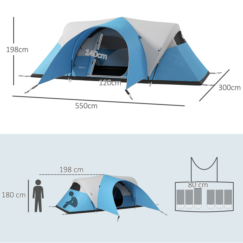 Explore the great outdoors with the Outsunny 5-6 Person Waterproof Camping Tent Blue. With a separate porch area to store muddy boots and gear, this tent ensures that your sleeping space remains clean and organised. And, thanks to its waterproof polyester fabric and sewn-in groundsheet, you can rest easy knowing that you'll stay dry even in heavy rain (up to 3,000mm). As night falls, the lantern hook will help illuminate your cosy retreat, while the mesh windows let you enjoy a refreshing breeze and stargaze in comfort. Don't let the elements ruin your camping trip - experience the ultimate in comfort and protection with this camping tent.