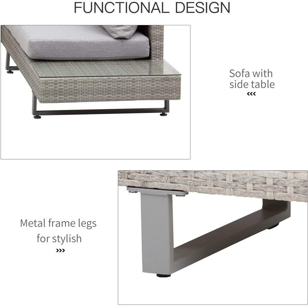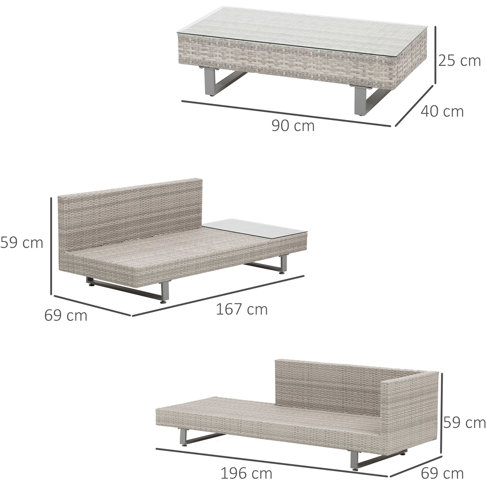 Transform your living space with this exquisite Outsunny 5 Seater Grey Rattan Garden Corner Lounge Set, featuring a two-seat sofa, a three-seat sofa, and a stylish table. Its open design creates an inviting atmosphere, allowing you to unwind comfortably. The plush seat and back cushions are designed for just the right amount of sink-in relaxation, while the removable and washable covers ensure upkeep is a breeze. Built with a solid metal frame wrapped in weather-resistant PE wicker, this set offers exceptional durability and strength. The sleek metal legs provide industrial charm while maintaining stability across all pieces. Assembly is required for set up. Dimensions include: Three Person Sofa Dimension: H59 x W196 x D69cm, Double Sofa Dimension: H59 x W167 x D69cm, Tea Table: H25 x W40 x L90cm, Double Sofa Seat Dimension: W127 x D60cm, Side Table Dimension: W40 x D69cm, and Three Person Sofa Seat Dimension: W188 x D60cm. The table capacity is 30kg, and the single sofa capacity is 160kg.