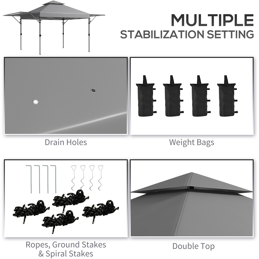 Grab your favourite drink and enjoy the shade of freedom with the Outsunny Five x Three m Grey Pop-Up Gazebo with Extend Dual Awnings. This gazebo has a free adjustable steel frame that offers a strong core and can be set to a height that is most suitable for you. The stakes, ropes and sandbags will stabilise your garden shelter on soft ground. It provides a shade for six to nine people with plenty of room. Its double Oxford fabric canopy top offers UV protection (30+), good air circulation and wind resistance. The powder-coated steel frame can handle wind, rain and sun exposure and has eight drainage holes to prevent rainwater from accumulating. Furthermore, dual awnings provide extra shading areas on two sides and offer wind and rain resistance when folded down. It also features a central button, which enables a single person to set up and break down the system effortlessly.