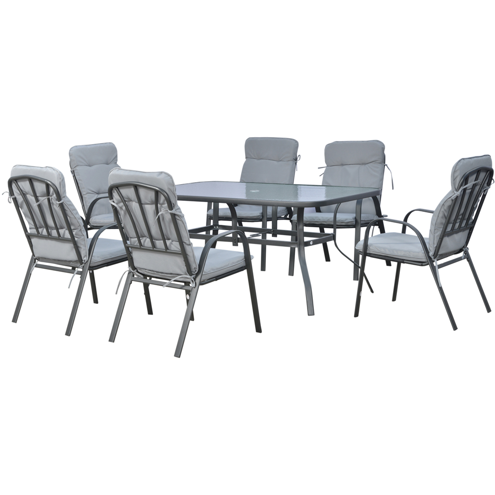 Enjoy socialising outdoors this summer using this Outsunny 6 Seater Black and Grey Garden Dining Set. Made from sturdy steel, this set includes six armchairs and a table. The chairs come with high backs, armrests, and padded seats for comfort and support. While the table is fitted with a stylish tempered glass table-top. It also has a 38mm parasol hole to offer you a cool shade. With this garden dining set, you can enjoy your time outdoors while comfortably socialising with your friends and family. Protect your garden furniture with our durable and waterproof covers. Explore our wide range of heavy-duty Garden Furniture covers to find the perfect fit for your needs.