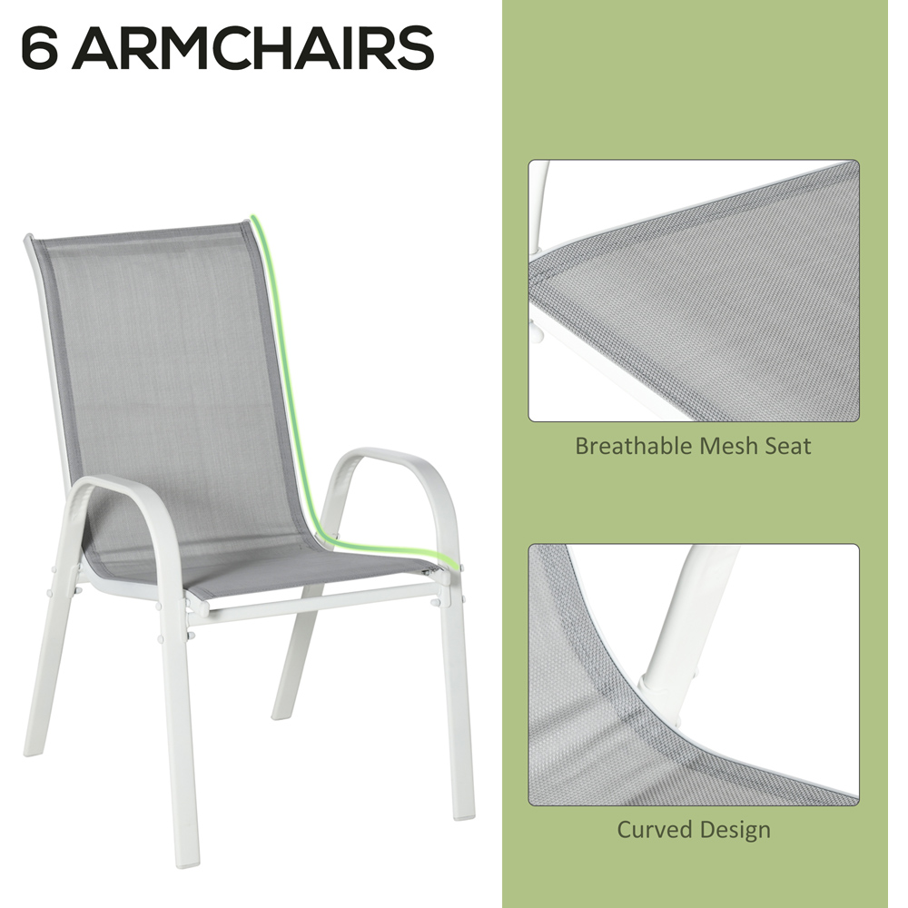 Enjoy outdoor dining with your loved ones on this Outsunny 6-Seater Grey Garden Dining Set. The set includes six garden dining chairs and a round glass-top table with an umbrella hole to protect you from harmful UV sun rays. Strong and rust-resistant, the metal frames come with a breathable mesh, making the chairs perfect for hot climates. Comfortable to use the chairs come with low arrests and high backs for extra support. Parasol hole diameter: 51mm. Protect your garden furniture with our durable and waterproof covers. Explore our wide range of heavy-duty Garden Furniture covers to find the perfect fit for your needs.