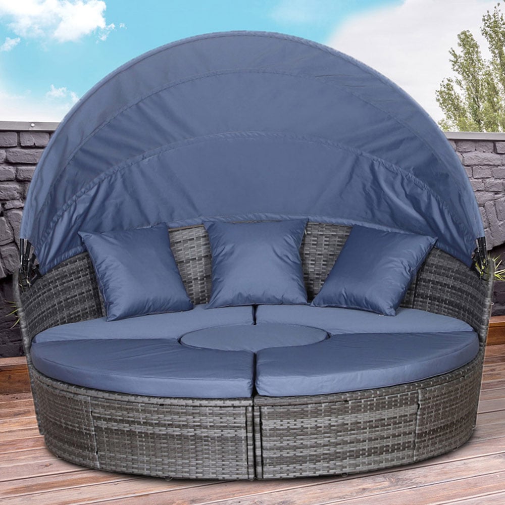 Enjoy summer with this Six-Seater Grey Cushioned Wicker Round Sofa Bed with a Coffee Table from Outsunny. The set includes four quarter-round chairs and a round table. Metal is used as the base frame for a strong and sturdy structure, and each piece is wrapped with PE rattan to provide a shield against light weather. It also features thick cushions on each seat of the rattan sun lounger, which have removable and washable covers. A large retractable overhead canopy completes this set to offer protection from sun glare and wind. Protect your garden furniture with our durable and waterproof covers. Explore our wide range of heavy-duty Garden Furniture covers to find the perfect fit for your needs.
