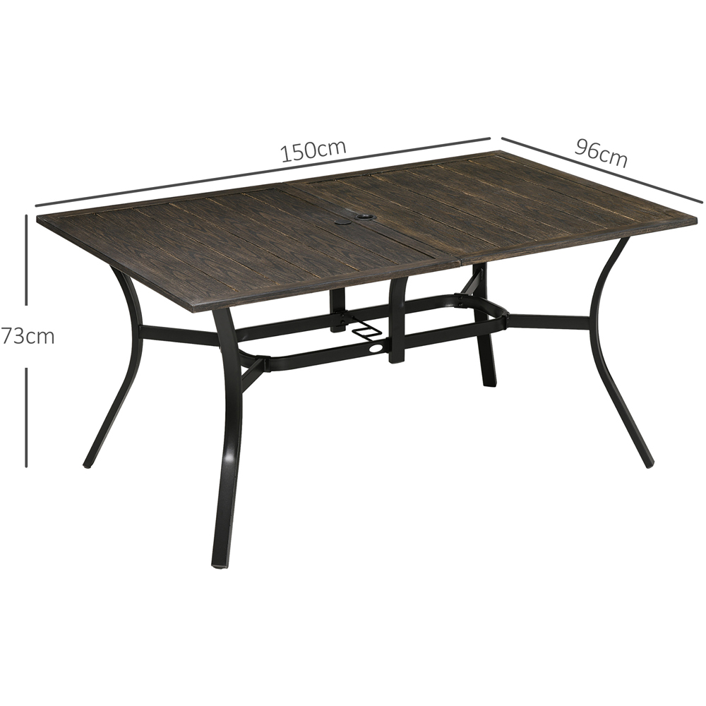 Elevate your outdoor dining experience with this robust Outsunny 6 Seater Wood Effect Steel Garden Table with Parasol Hole, perfect for gatherings under the sun. Crafted from full steel, this sturdy piece promises lasting durability, making it an ideal choice for outdoor use. Enjoy ample shade and protection from the elements with the 4.1 cm umbrella hole, allowing you to effortlessly add a parasol. Designed to accommodate up to six people, this spacious garden dining table is perfect for hosting cherished friends and family. The rustic wood-effect tabletop not only brings a natural aesthetic to your space but is also built to withstand the rigours of outdoor living. Overall Dimensions: H73 x W96 x L150cm. Umbrella Hole Size: 4.1cm. Maximum Load: 50kg.