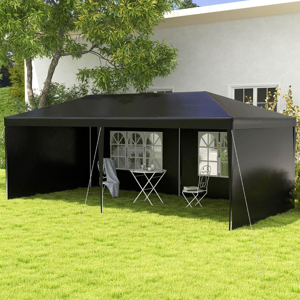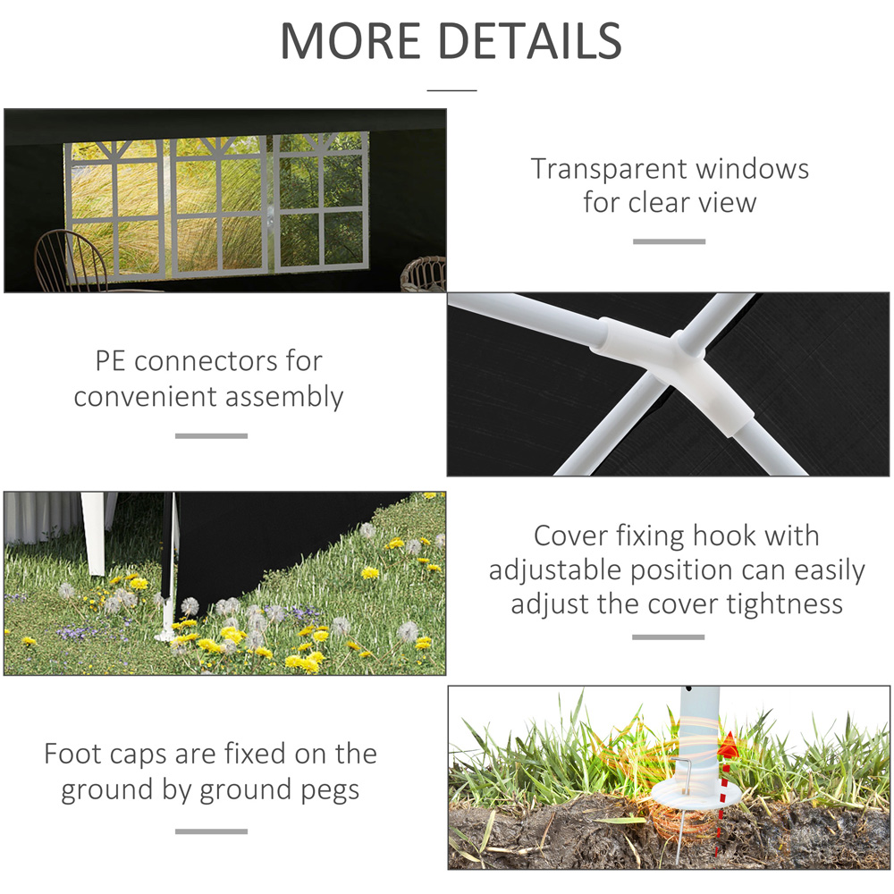 The Outsunny 6 x 3m Black Party Tent Gazebo with Windows and Side Panels offers a secure shelter for outdoor entertaining. This marquee gazebo is constructed with a sturdy steel frame and a durable plastic canopy that covers half of the structure, providing an open and spacious atmosphere. To ensure stability, it comes with six guy ropes and 12 ground pegs that can be securely fastened to the ground. This versatile gazebo is perfect for various events such as BBQs, family parties, wedding receptions, and more. With its large size and protective canopy made of polyethylene plastic, this camping gazebo provides ample space and shields you from direct sunlight, light rain, and wind. Setting it up is a breeze, saving you time and effort, and it can be easily packed away when not in use. The adjustable feet also ensure that the gazebo remains stable even on uneven ground.