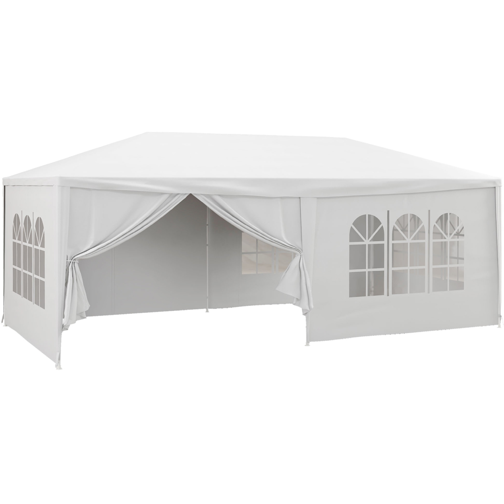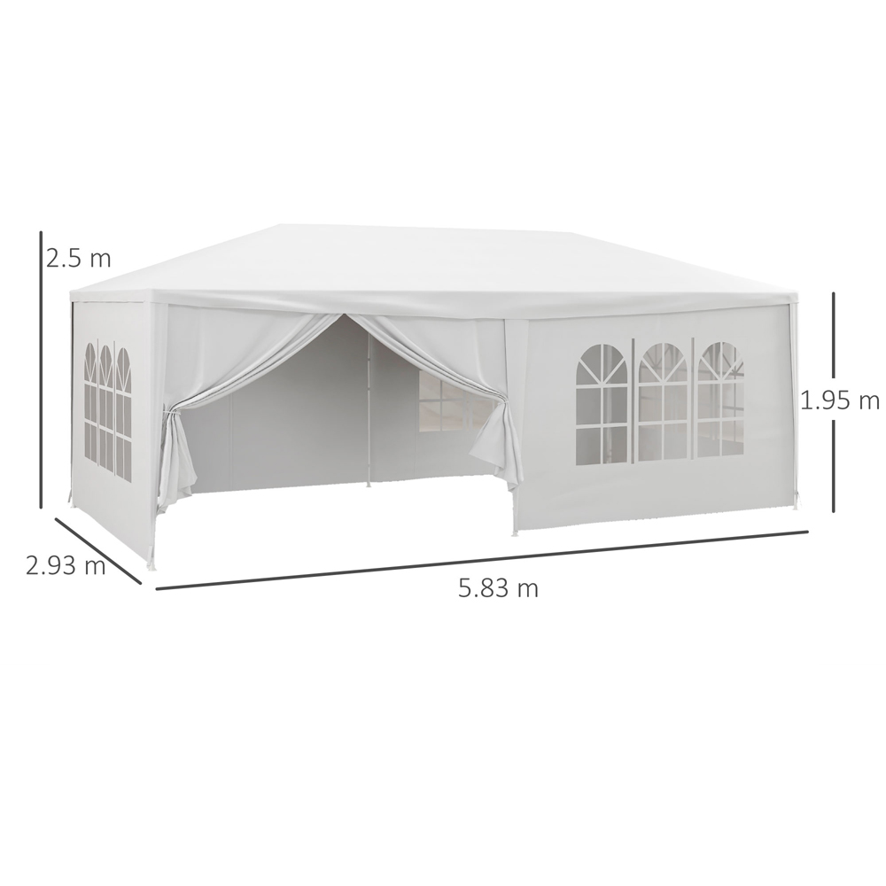 Make your weddings and outdoor gatherings more memorable with the Outsunny White Marquee Gazebo Party Tent. This gazebo is ideal for all types of gatherings, parties or weddings. This gazebo has a sturdy metal frame structure that keeps it stable and upright, with 12 drainage holes at the top to prevent rainwater build-up. The gazebo features two rooms, helping you to create a barrier between parties when required. It also features removable sides and is easy to transform from a private space into an open space, creating an inviting area for everyone. The package includes guy ropes and ground nails for extra stability. Dimensions: 6 x 3m. Assembly required.