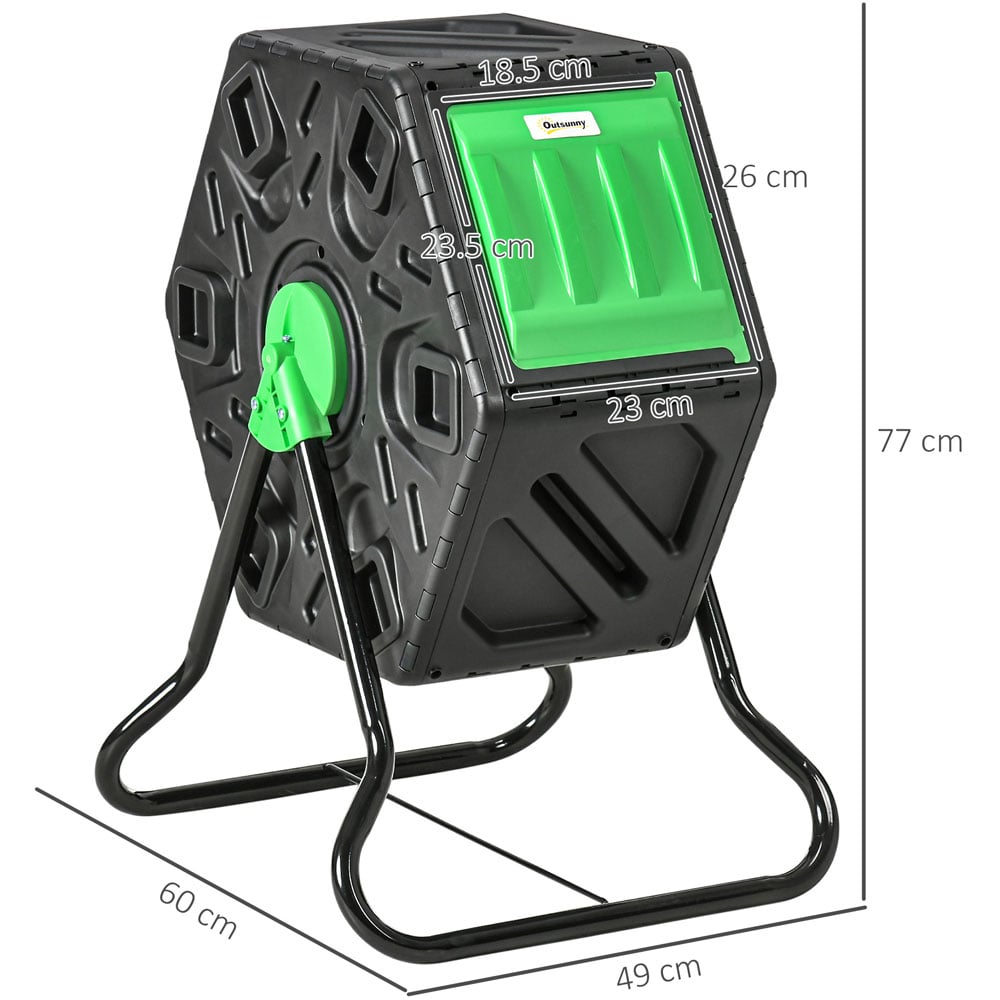 Provide your plants with key nutrients for healthy growth with Outsunny Garden Compost Bin. Perishable foods can now be put to good use, giving your plants nutrient-package compost for beautiful growth. Great for light use, this garden compost bin will give you rich fertiliser for one-three months. Simply fill this 65L compost maker with waste and wait between one and three months. Featuring 48 ventilation holes - it allows plenty of air inside this rotating composter, helping with the decomposition process. With the 360-degree tumbling design, you can easily turn this compost bin, mixing the inside contents without having to touch the inside. Assembly required. Specifications: Colour: green and black, Material: Steel, PP, Overall Dimensions: 60L x 49W x 77H cm, Chamber Door Size: 18.5W x 23.5Hcm.