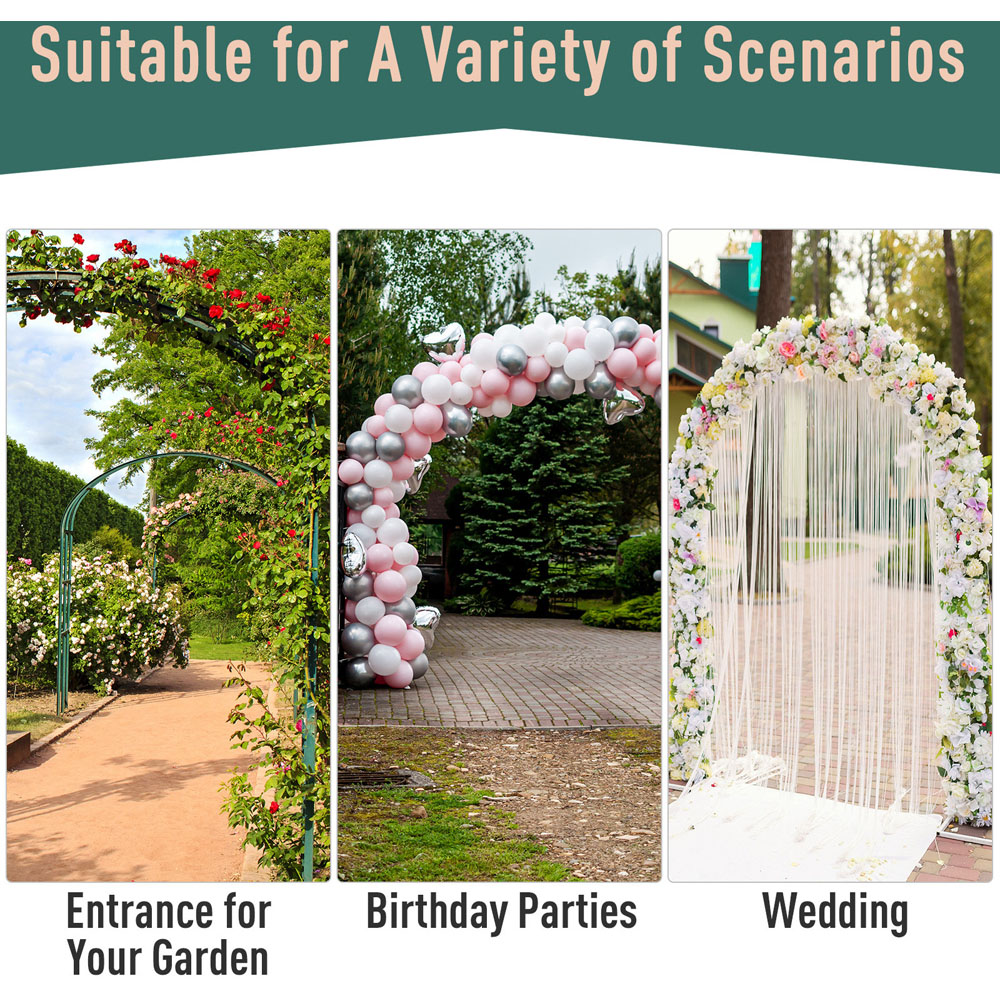 Impress all your guests with this Outsunny Black Metal Garden Entrance Arch with Gate and Trellis Sides. Stylish and elegant, the frame is crafted into a tall and impressive design, while the trellis sides provide a place for vines and climbing plants to grow. The hanging rails on the top are perfect for flower baskets and the two doors at the front with elegant scrolling allow you to get through in the uttermost exquisite manner. For safety, the gate comes with latches for added peace of mind and the impressive size of this arch adds to the overall security. Strong and durable, the arch is made using powder-coated metal for extra sturdiness and durability.
