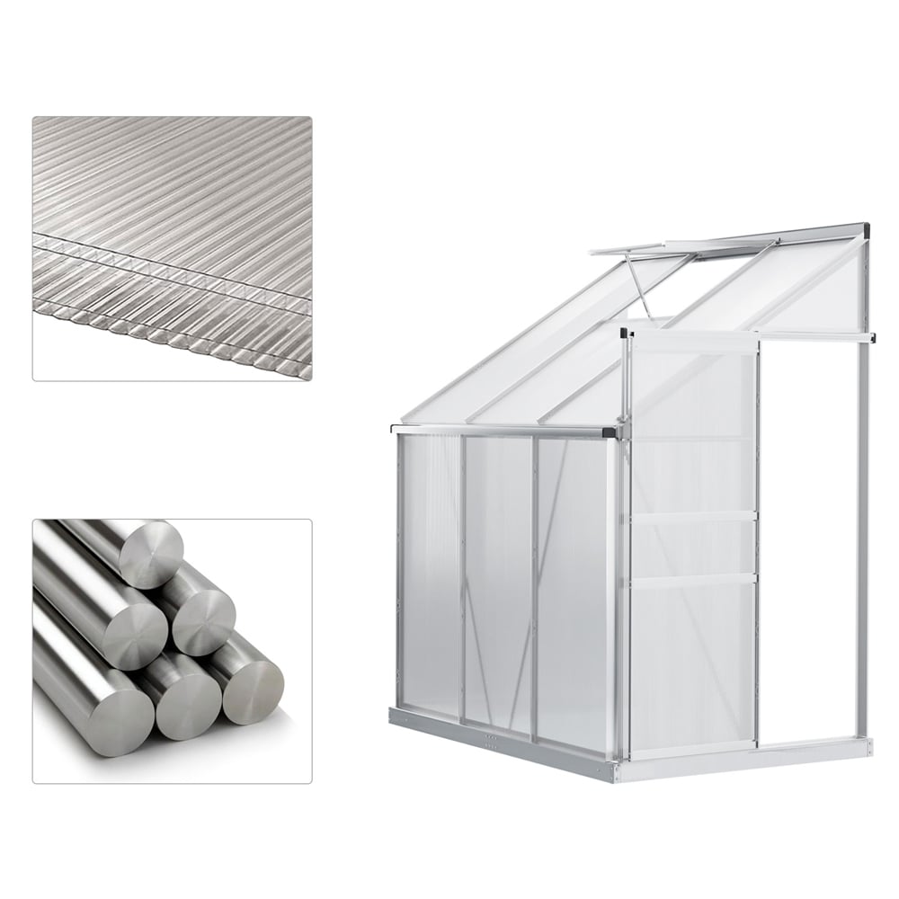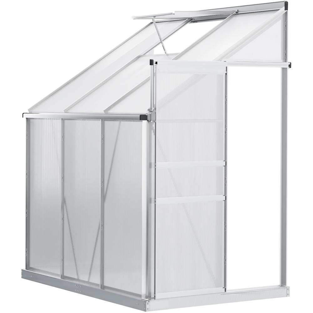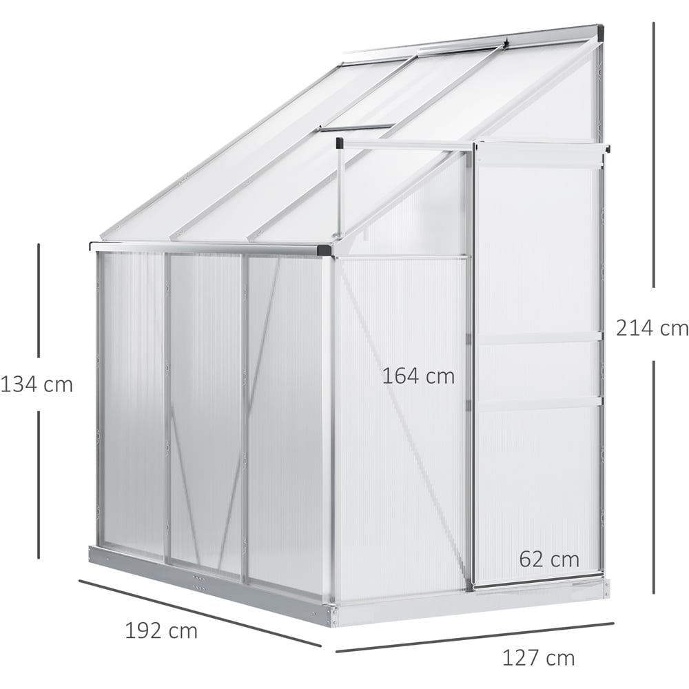 This lean-to greenhouse from Outsunny is every gardener's dream. The on-wall design will not take up too much space. The aluminium alloy frame creates a durable structure, whilst polycarbonate panels create a safe and heat-retentive shelter. It also features rain gutters to prevent water build-up. With a tough structure, the metal greenhouse stands as it should in place. Galvanised steel base for extra support on the bottom - stands steady. This 6 x 4ft space-saving solid greenhouse can help you grow and nurture plants all year round, protecting them from cold. This lean-to conservatory is perfect for vegetables, fruit, herbs and flowers. It features a door for easy access in and out, and the window lets fresh air inside. Dimensions: H214 x W192 x D127cm. Door: H158 x W62cm.