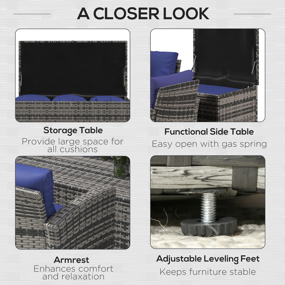 Bring a touch of colour to your outdoors, with space to keep it tidy, thanks to this rattan sofa set from Outsunny. Powder-coated steel frames of the garden furniture set for a tough structure are wrapped in PE wicker, adding extra strength and protection for garden use. Padded cushions ensure comfort and complement the mixed colour rattan. The storage of both tables of the garden set helps you keep your space tidy at all times. Summer has never looked so vibrant. Sofa Dimension: (Triple) H77 x W183 x D72cm, (Double) H77 x W128 x D72cm, (Single) H77 x W72 x D72cm; Table Dimension: (Tea table) H40 x W120 x D60cm, (Side table) H64 x W70 x D70cm; Storage Dimension: H35 x W56 x L116cm (Tea table), H59 x W66 x L66cm (Side table); Weight Capacity: 160kg (Per seat), 70kg (Tea table), 50kg (Side table).