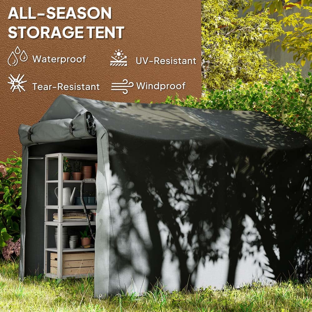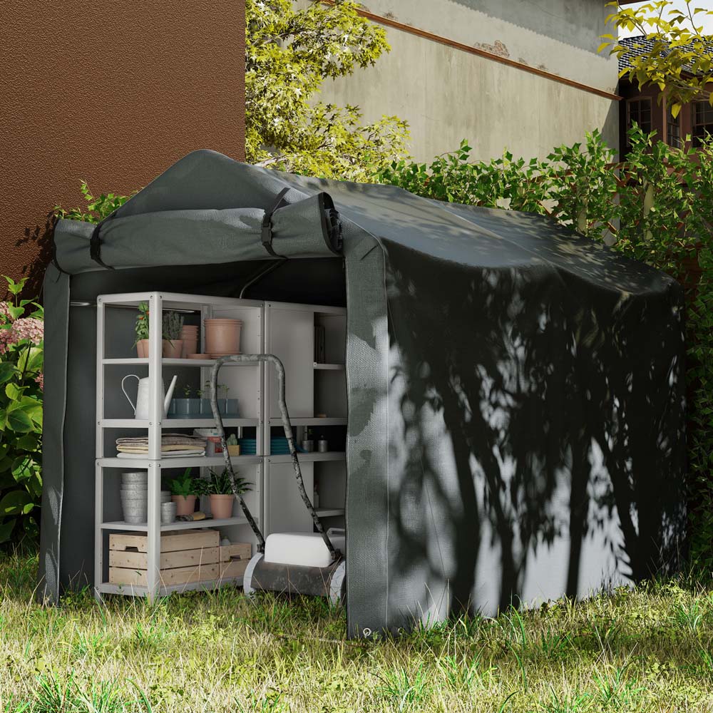 Discover the Outsunny garden shed, your spacious solution for stashing everything from bikes to pool gear. Crafted with UV-resistant PE cloth and a robust galvanised metal frame, this motorbike shed keeps your items protected come rain or shine. Plus, its roll-up zipped door enhances air flow and makes access a breeze. Great for anyone seeking a versatile outdoor shed.