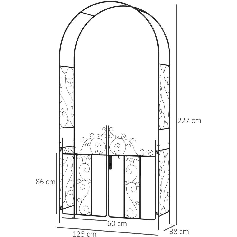 Whether you need a wedding arch or a garden accent, make an entrance with Outsunny. This metal garden arch gate features fanciful flourishes embellishing every end with vine-like swirls. The door locks, acting as a partition and speaking of vines, our arbour helps them climb. Grow grapes and ivy, watching them reach to the top with a trellis on each side and a roof for hanging plants to bridge the gap. String up lights or balloons garden or wedding arch, it's versatile enough to let you choose.