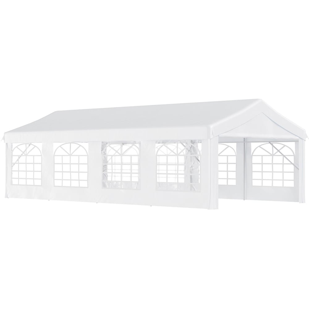 Add a perfect cosy spot in your garden with this Outsunny 8 x 4m Marquee Carport Shelter Gazebo with Sides. This tent is perfect to create a warm atmosphere for family gatherings, friend's birthdays, BBQs and more. Durable and sturdy, it is made with a galvanised steel frame and a polyester shell to host inside. Easy to use, the walls can also be removed to create an open atmosphere when you want. Also, this tent includes two doors for easy access along with eight windows for better ventilation. It comes complete with four guy ropes and twenty-two ground stakes to pin and fix to the ground. Size: 8 x 4m.