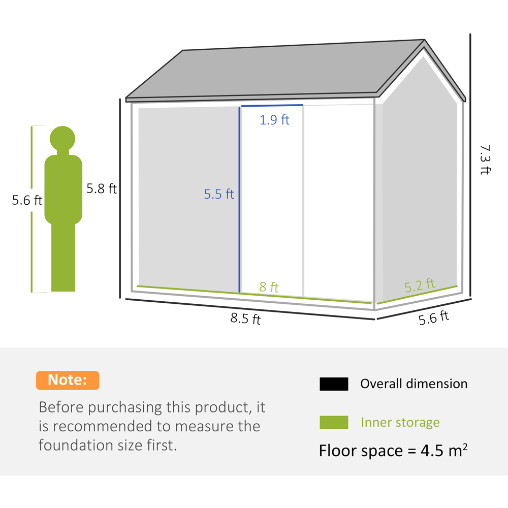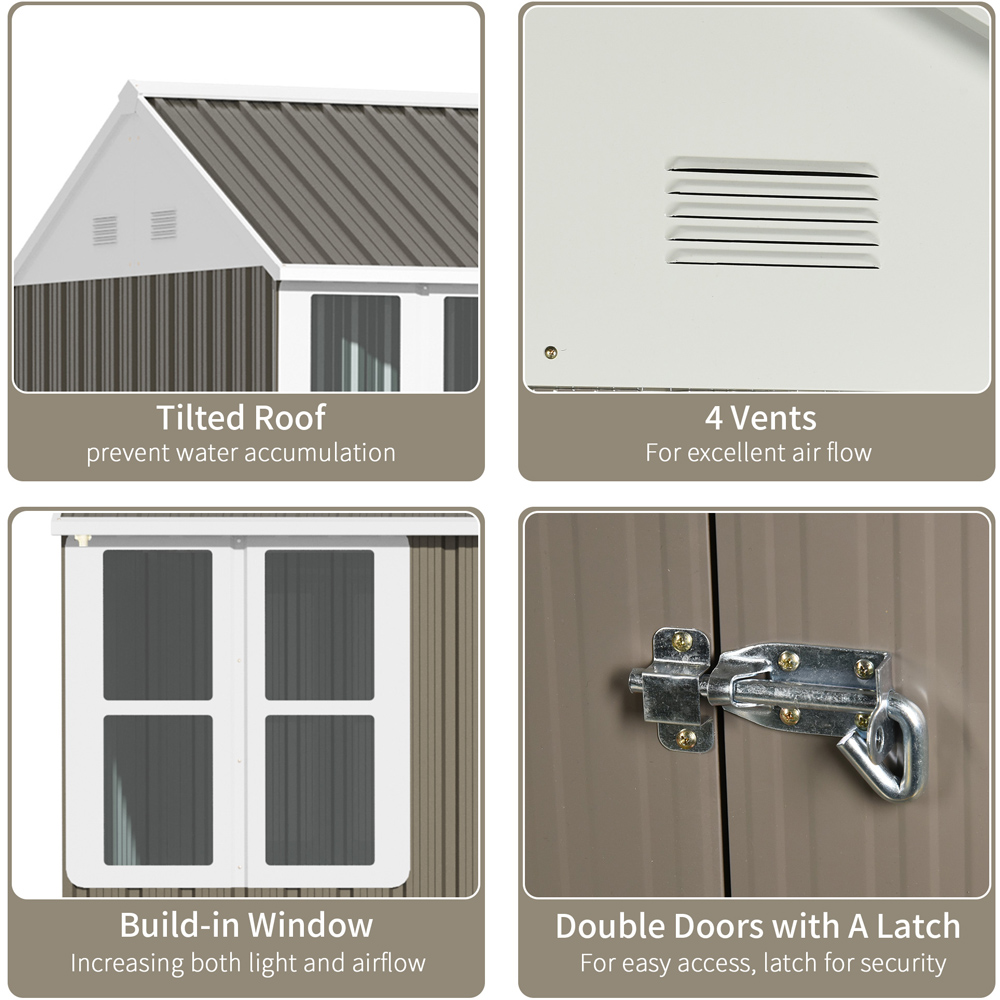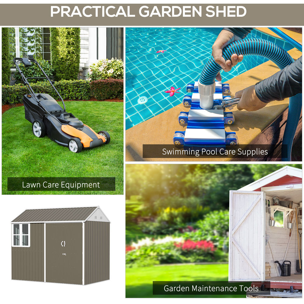 Store your garden accessories with this 8 x 6ft Grey Double Door Steel Garden Shed by Outsunny. This metal shed is an excellent addition to every outdoor space. The 4.5㎡ space offers plenty of storage room. It features two doors with a latch lock for security, easy access, and air vents to keep the inside aerated, while the window allows natural light to pour inside. Made from metal, the structure is solid and suitable for outdoors, while the floor foundation is not included in this garden shed.