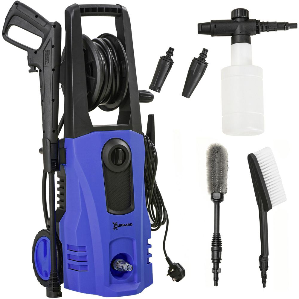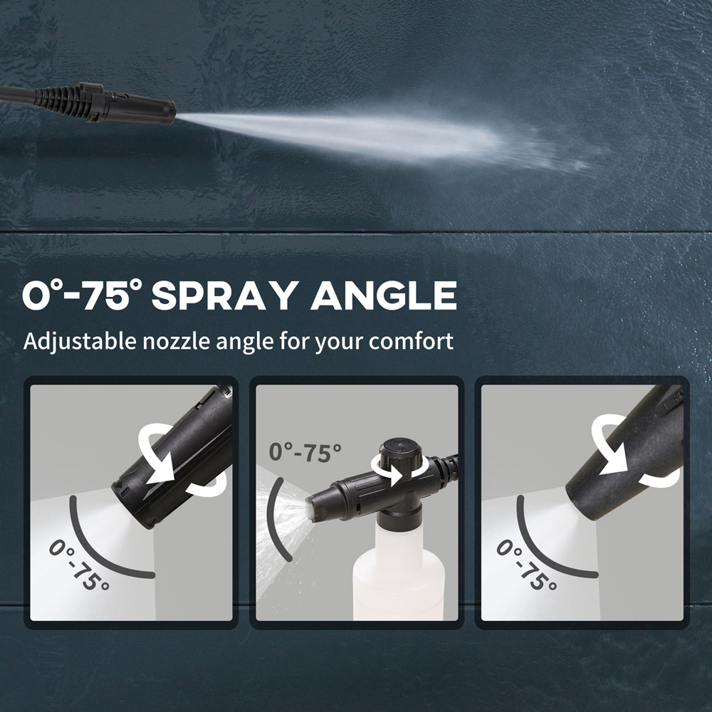 Make your outdoor space shine with the Outsunny 845-867V71BU Blue High Pressure Washer 1800W. Easy home cleaning of stubborn tasks, this portable pressure washer features a 1800W motor with a 150 bar pressure, providing 510 litres of water hourly. The jet washer is suitable for vehicles, outer walls, deck floors, outdoor furniture, garden fences, and so much more. The pressure washer comes with a spray gun, a wand, a hose, an inlet adaptor, a snow foam bottle, a nozzle and a nozzle cleaner. Integrated gun, hose, and power cord to keep everything neatly in one place. You can adjust the nozzle angle between 0° and 75°, making it easy to direct the pressured water to a position you require. With the six-metre long hose, five-metre long power cord and wheels, you can move it around and reach long distances easily.