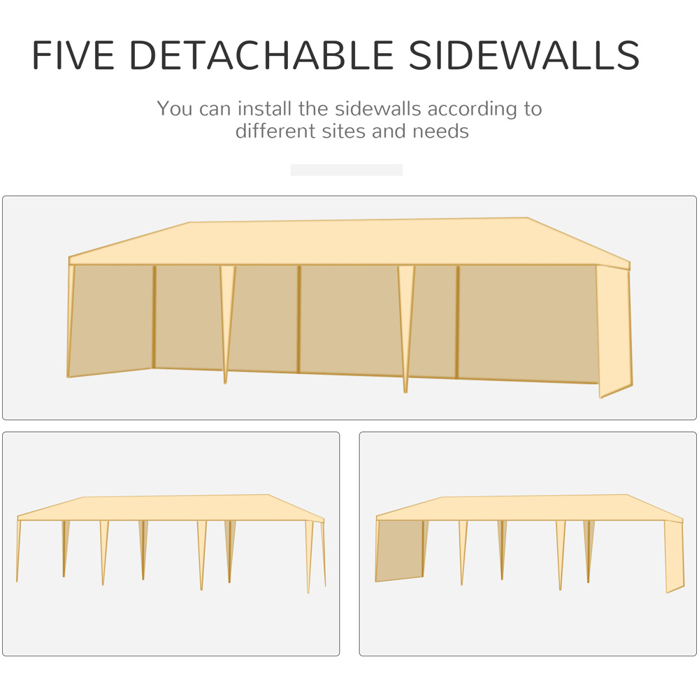 The Outsunny 9 x 3m White Party Tent Gazebo is an excellent addition for any entertaining occasion. Constructed with a solid steel frame and a high-quality 90g/m2 PE cloth, this gazebo offers durability and reliability. It also includes eight pull ropes and 16 ground anchors, ensuring stability even in windy conditions. Whether it's a wedding, camping trip, party, or picnic, this marquee gazebo with sides is versatile and suitable for various events.