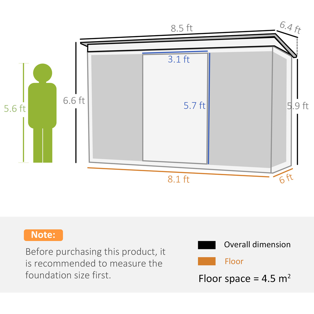 Store your outdoor essentials safely with the 9 x 6ft Grey Metal Storage Shed by Outsunny. This freestanding shed offers a protective and spacious storage solution for tools, equipment, and outerwear. The galvanized steel construction ensures strength and durability, while the sloped roof prevents rainwater buildup. The two clear front panels allow for easy visibility inside during the day, and the lockable sliding doors provide quick access.