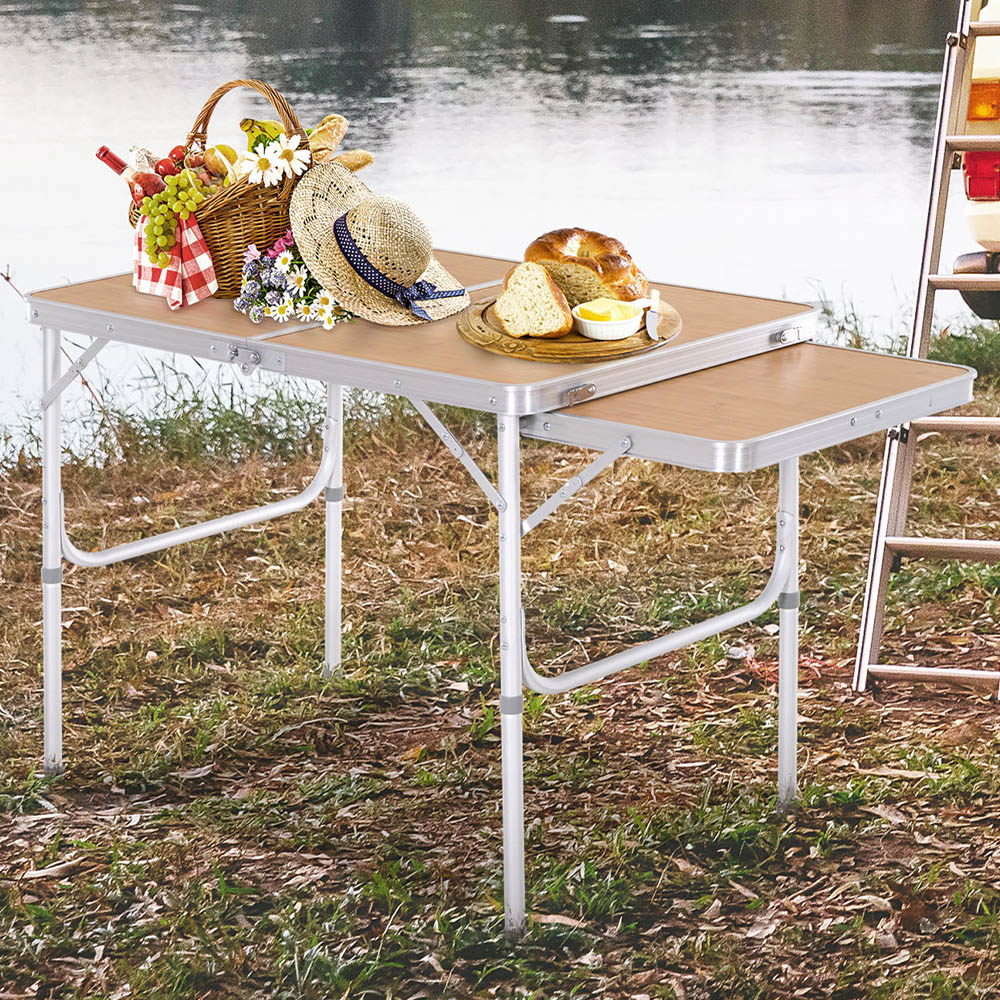 Ensure you have the perfect dining spot while camping with this Outsunny Aluminium 4 Seater Foldable Height Adjustable Picnic Table Silver. Featuring a foldable design, this table is made using an aluminium frame with four legs, making it lightweight and suitable for outdoor use. It can handle a weight of 30kg, great for eating with your family and friends. Easy to maintain, the table is covered in an oak-coloured MDF top and finished with a small pull-out side table to provide extra holding or dining room if required. Portable and lightweight, the table folds into itself, so no carry bag or case is required. Sturdy and durable, the aluminium frame is resistant to rusting making it a perfect option for outdoors.