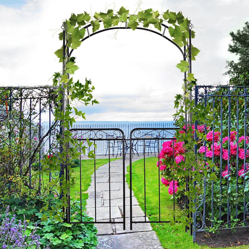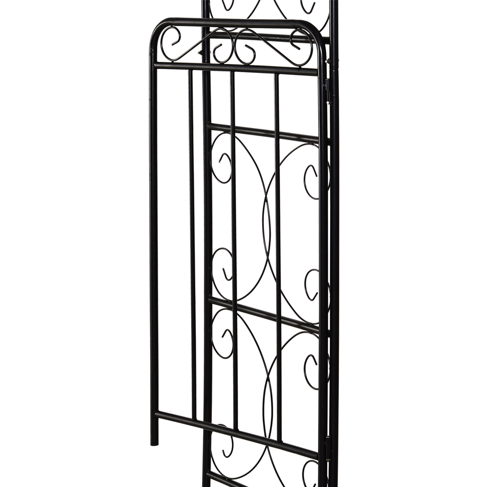 Create a magical gateway into your garden and beyond with this Outsunny Antique Black Metal Garden Arch with a Gate. Crafted with metal in a matte black powder coating, the frame of the gate is extremely tough and durable for a mainstay in your garden. The two doors on the front allow you to walk through while the trellis on the sides and bars at the top are perfect for hanging flower baskets to make a unique, colourful spot in your outdoor space. Perfect for small and large gardens alike, the archway makes a fantastic addition to any outdoor. For safety, it comes in a double gate design with latches for extra security when you're out. Size: 215x 45 x 108cm.