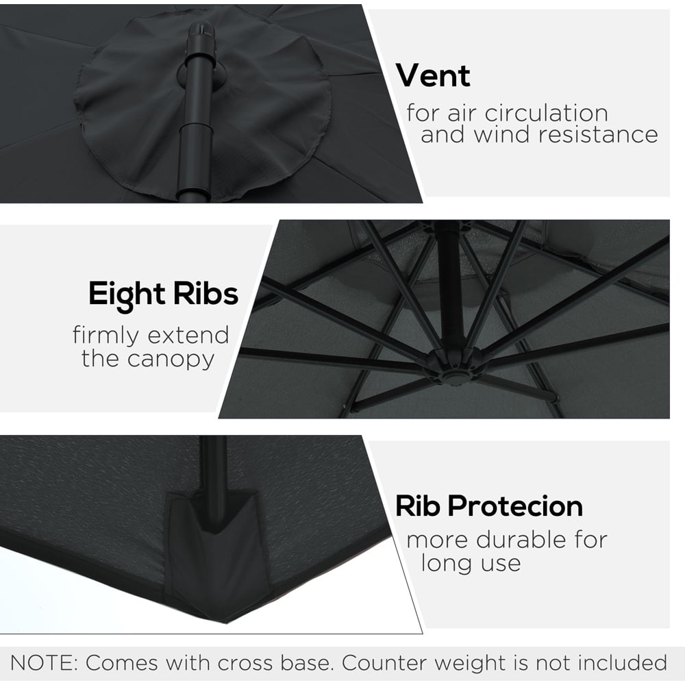 Relax outdoors during the evening time under the Outsunny Black Cantilever Banana Parasol. This 3m canopy is crafted using heavy-duty, UV and fade-resistant polyester fabric for durability and longevity. It features a sturdy and rust-resistant, powder-coated steel frame with eight connected ribs for stable support. The cantilever design keeps the pole out of the way while the cross base ensures high stability creating a suitable shade for relaxation in your outdoor living area. Looking for a way to keep your parasol secure and protected and enjoy some shade? Check out our selection of parasol bases, designed to keep your parasol in place while you relax and parasol cover to keep them protected.