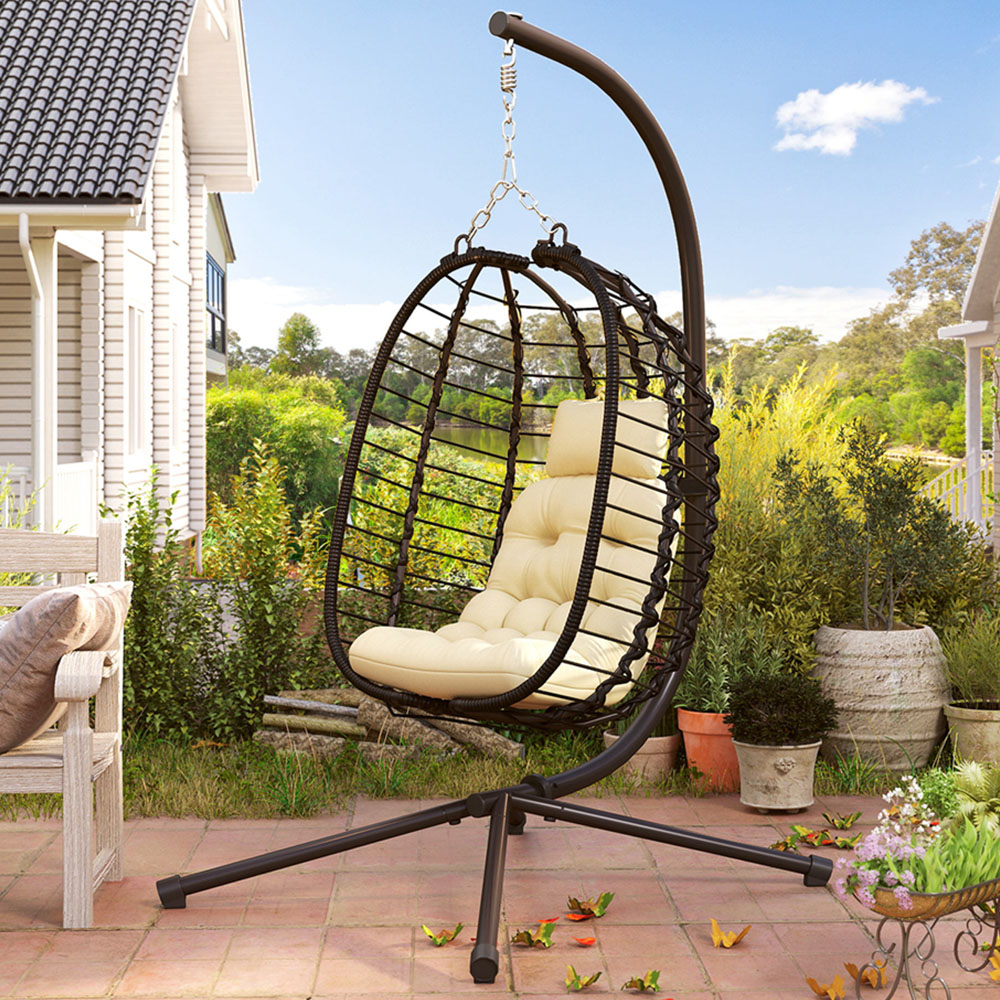 Discover the charm of the Outsunny Rattan Egg Swing Chair, blending style and comfort. Its robust steel frame with chic rattan weaving withstands the elements, while the padded cushion and removable headrest contour to your body for relaxation. Great as a garden swing chair or a cosy indoor retreat, it easily adjusts in height and folds for space-saving storage. The swing chair features a rust-resistant steel frame with an X-shape support at the bottom for stability. Crafted with PE rattan and a rope-weaving back, it resists fading under the sun and rain, offering weather-resistant durability. Includes a 10cm thick PP cotton cushion and a removable headrest, designed to fit the body curve and reduce fatigue, making this outdoor swing chair a cosy retreat. This outdoor egg chair boasts a foldable design for easy storage and maximises your living space. Easily adjust the hanging height using the chain to customise your lounging experience.