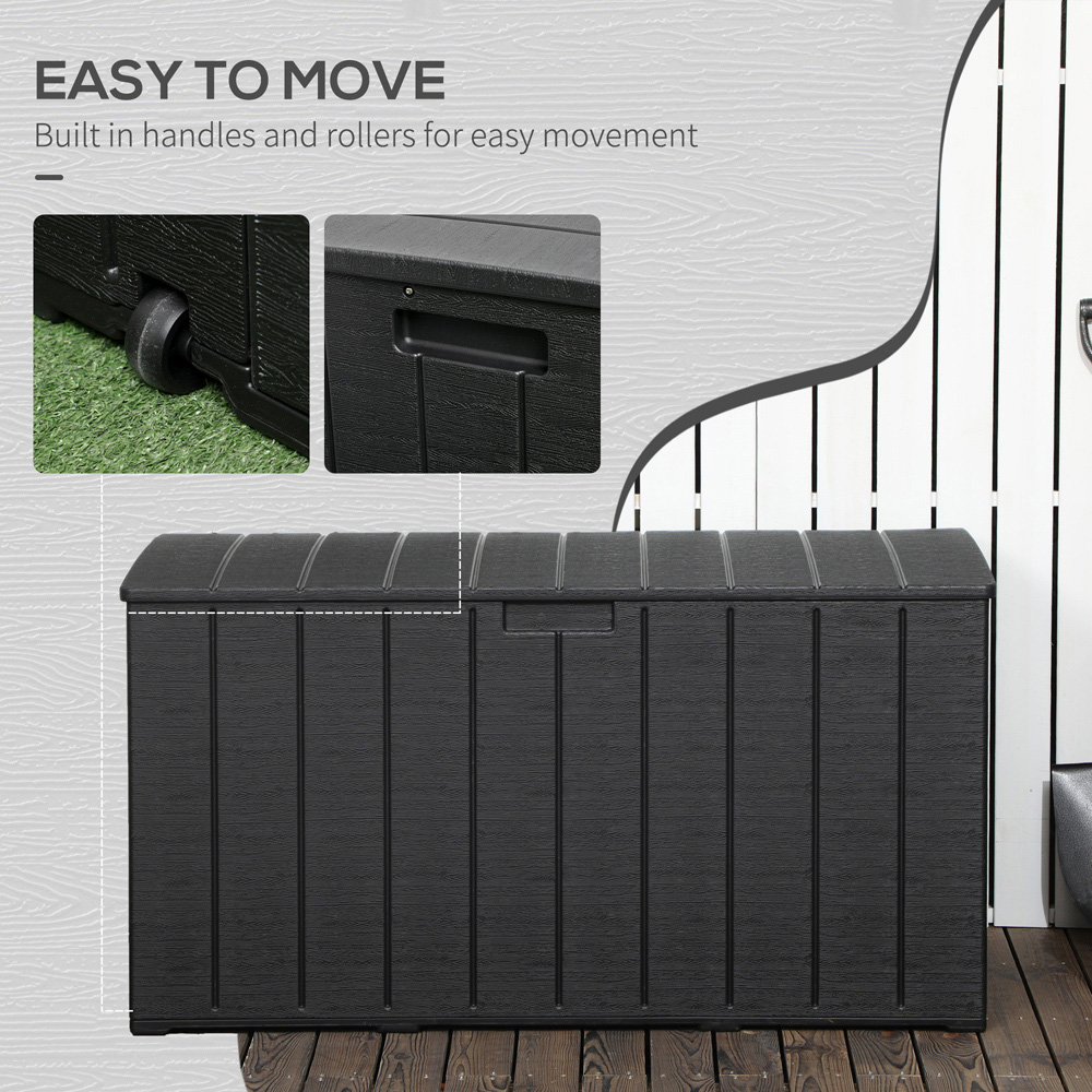 Upgrade your outdoor space with the Outsunny Black Extra Large Garden Storage Box, a tough and beautiful outdoor storage piece. The 366L capacity, sized at 122.4 x 62cm, makes it a generously sized piece, providing plenty of holding room for garden accessories, tools and more. Made from plastic in a double-wall construction, this box is strong, with a smooth hydraulic piston-assisted opening lid to make everything easy for you. Comes with two handles and rollers, so you can move it around easily, whether empty or full.